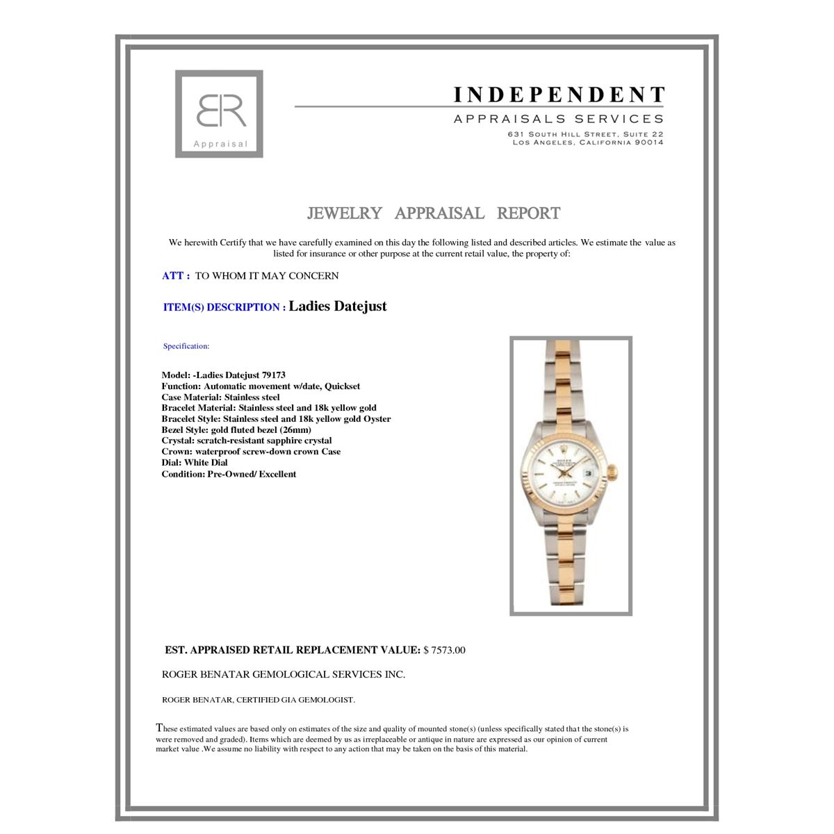 Model/Style-Ladies Datejust 79173 Serial/Year-Random Features-Automatic movement w/ date, Quickset, scratch resistant sapphire crystal, waterproof screw-down crown Case-Stainless steel w/18k gold fluted bezel (26mm) Bracelet-Stainless steel and 18k yellow gold Oyster #9145