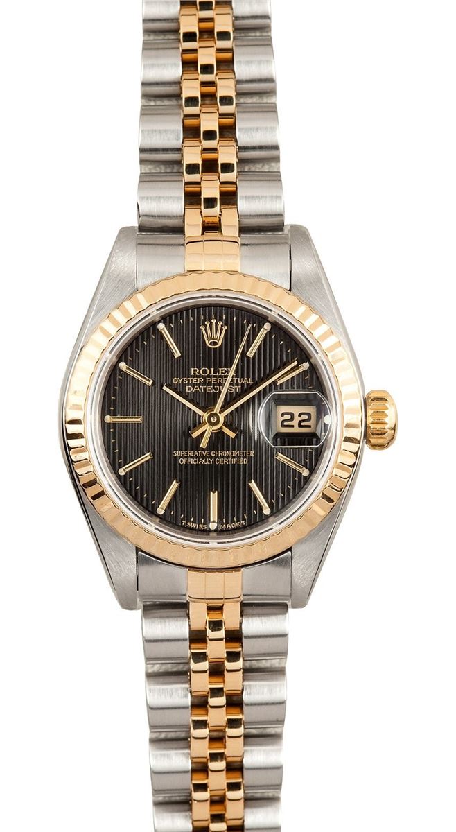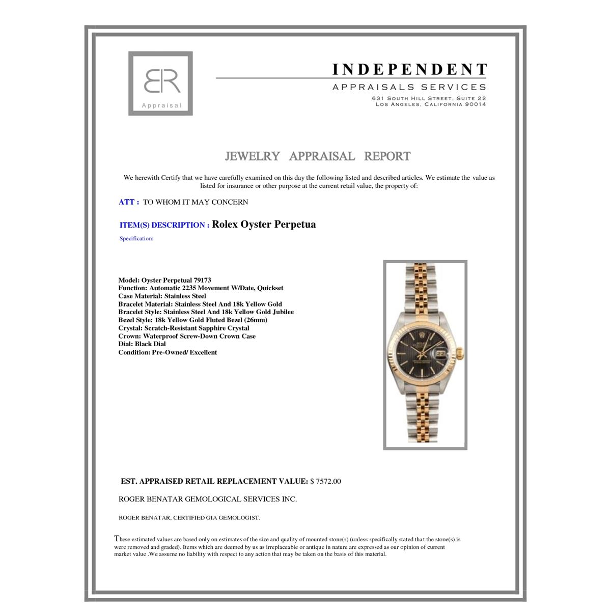 Model/Style-Oyster Perpetual 79173 Serial/Year-Random Features-Automatic movement w/ date, 2235 Movement, Quickset, scratch-resistant sapphire crystal, waterproof screw-down crown Case-Stainless steel w/ 18k yellow gold fluted bezel (26mm) Bracelet-Stainless steel and 18k yellow gold Jubilee #9160