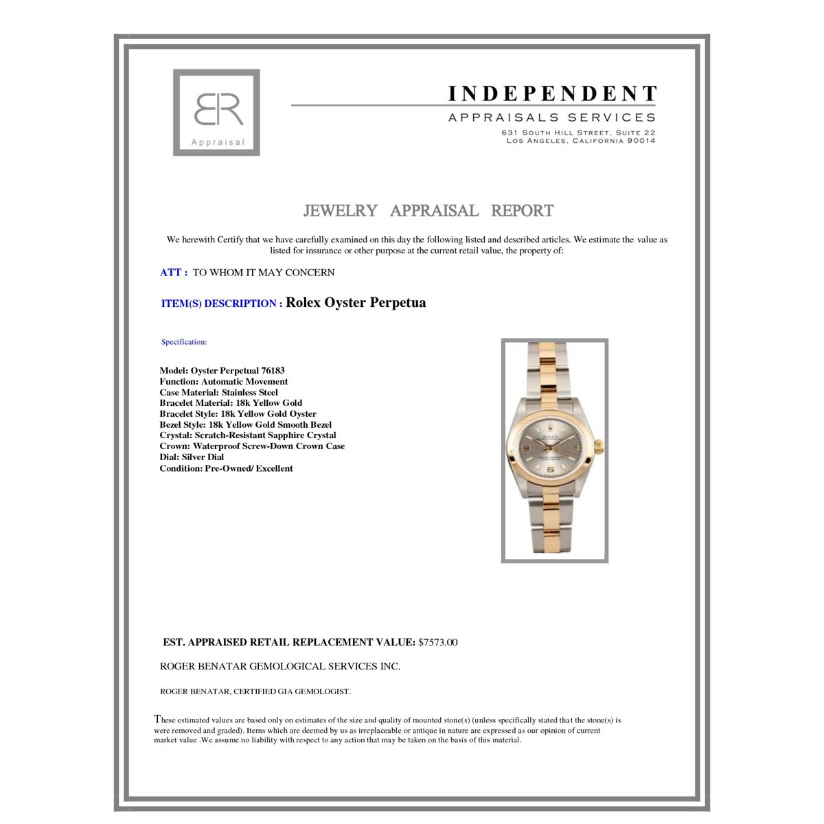 Model/Style-Oyster Perpetual 76183 Serial/Year-Random Features-Automatic movement, scratch-resistant sapphire crystal, waterproof screw-down crown Case-Stainless steel w/ 18k yellow gold smooth bezel Bracelet-Stainless steel and 18k yellow gold Oyster #9164