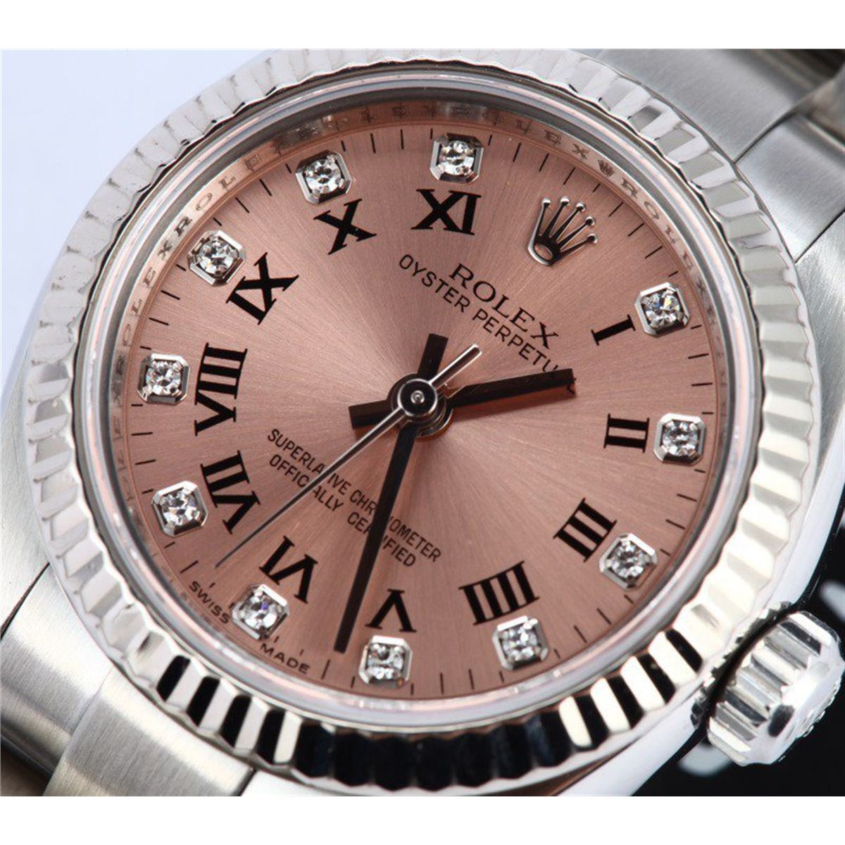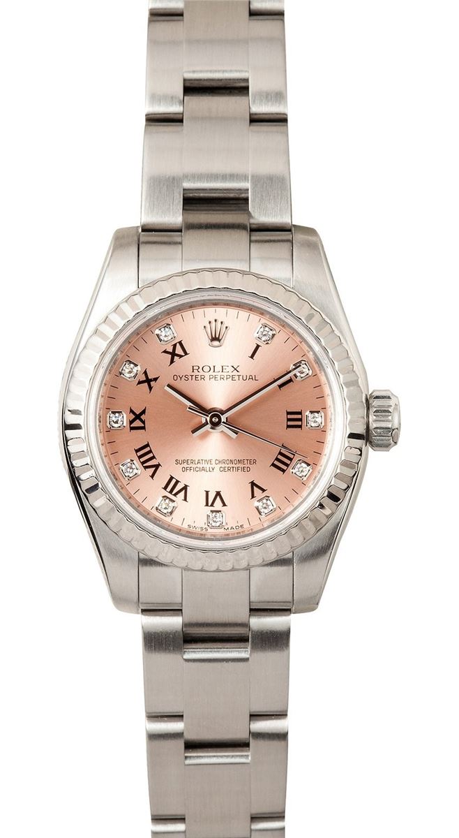 Model/Style-Oyster Perpetual 176234 Serial/Year-Random Features-Automatic movement w/date, 31 jewels, Quickset, scratch-resistant sapphire crystal, waterproof screw-down crown Case-Stainless steel w/18k white gold fluted bezel (26mm), inner reflector ring engraved w/ serial number Bracelet-Stainless steel Oyster w/ Glidelock clasp #9165