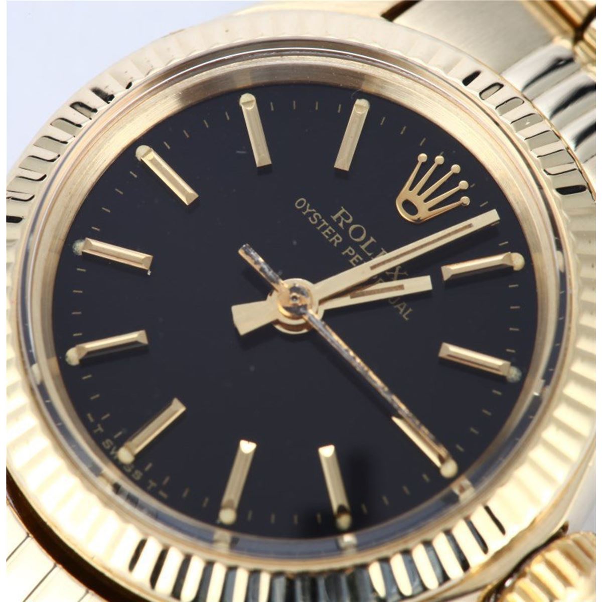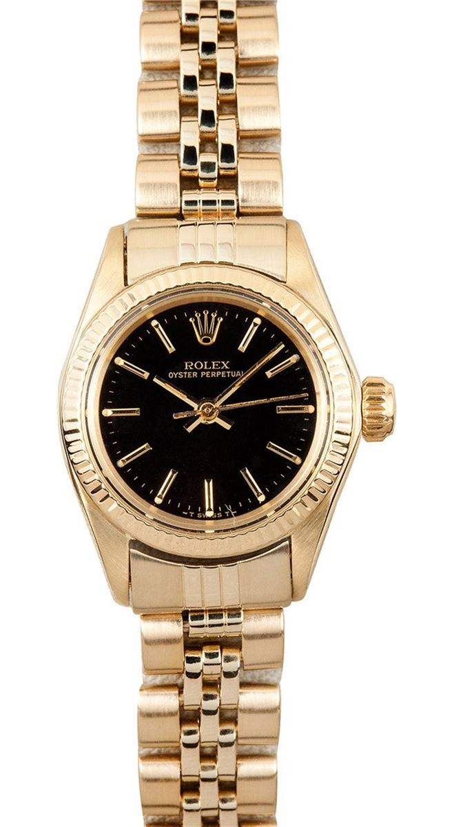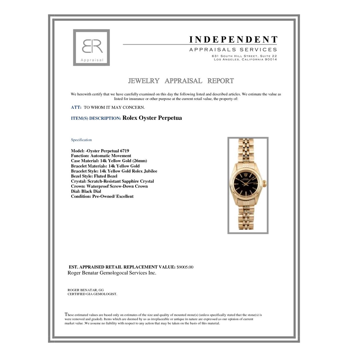 Model/Style-Oyster Perpetual 6719 Serial/Year-Random Features-Automatic movement, acrylic crystal, waterproof screw-down crown Case-14k yellow gold (26mm) w/ fluted bezel Bracelet-14k yellow gold Rolex Jubilee #9174
