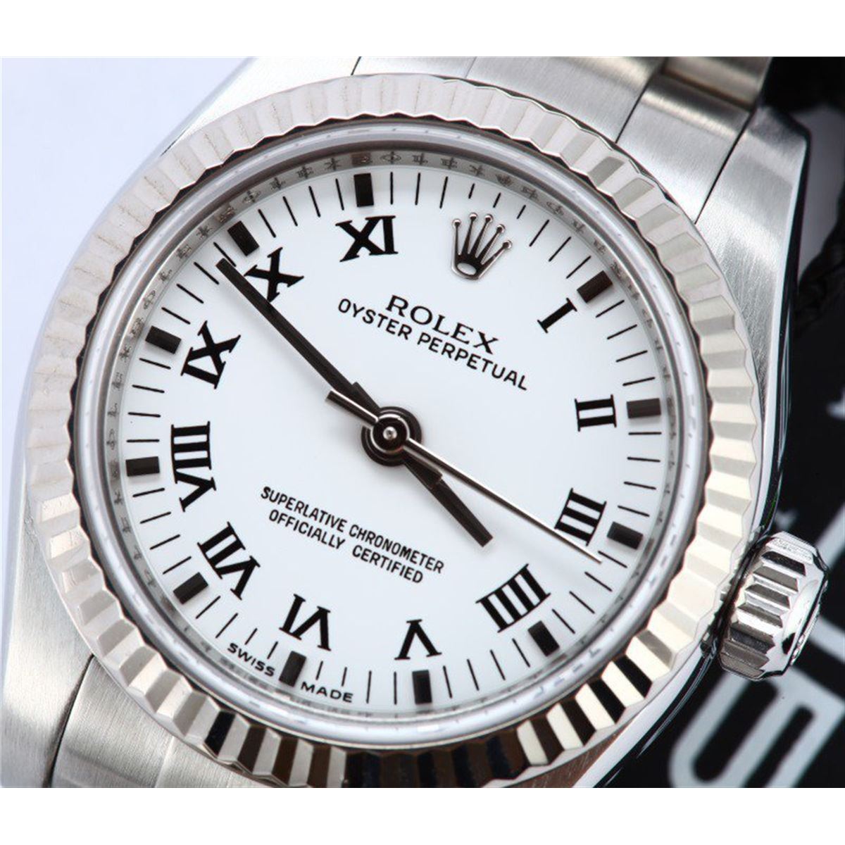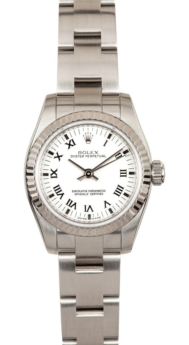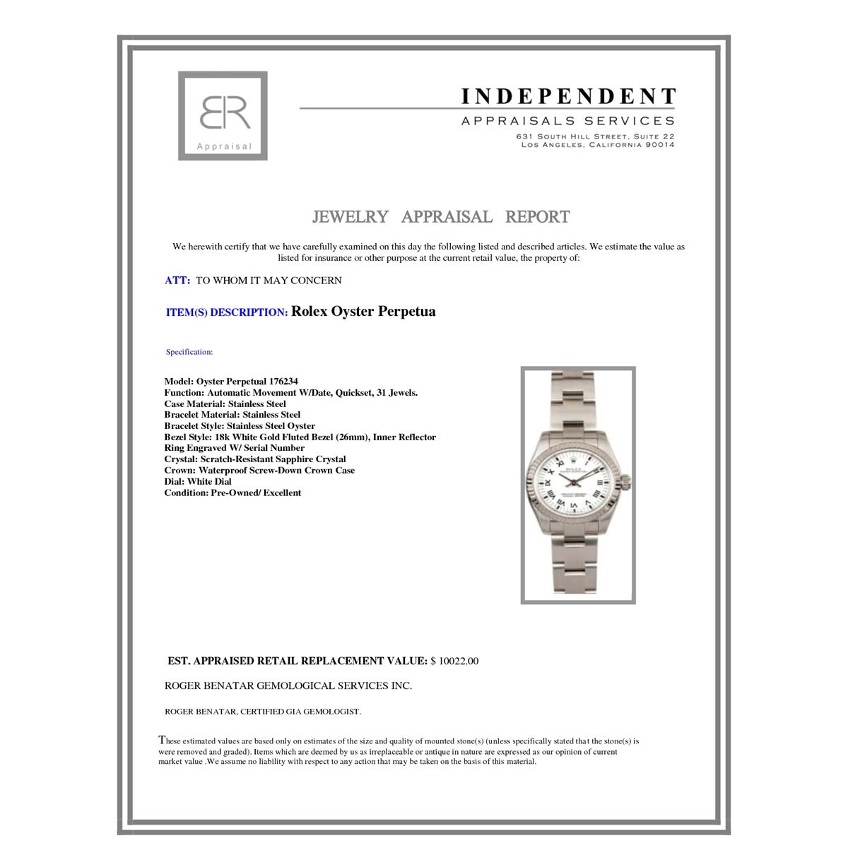 Model/Style-Oyster Perpetual 176234 Serial/Year-Random Features-Automatic movement w/date, 31 jewels, Quickset, scratch-resistant sapphire crystal, waterproof screw-down crown Case-Stainless steel w/18k white gold fluted bezel (26mm), inner reflector ring engraved w/ serial number Bracelet-Stainless steel Oyster #9166