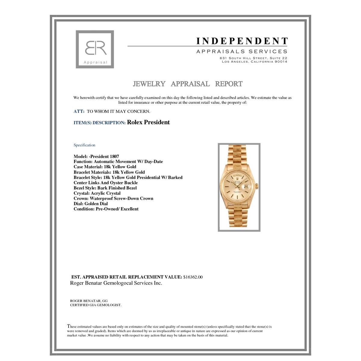 Model/Style-President 1807 Serial/Year-Random Features-Automatic movement w/ day-date, acrylic crystal, waterproof screw-down crown Case-18k yellow gold w/ bark finished bezel Bracelet-18K Yellow gold Presidential w/ barked center links and Oyster buckle #9176