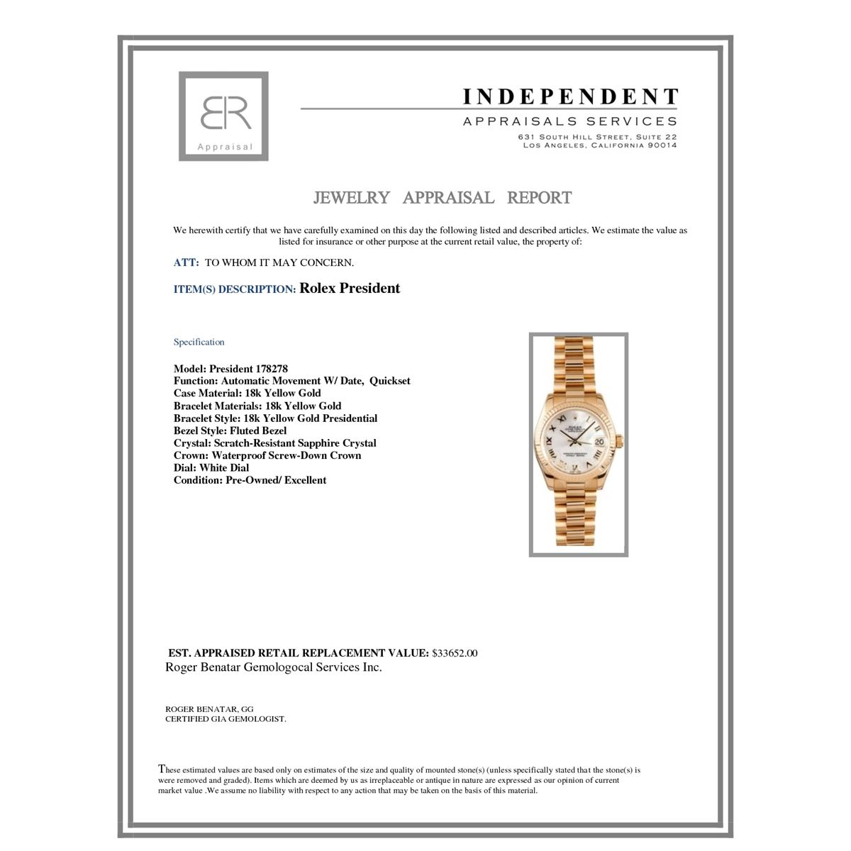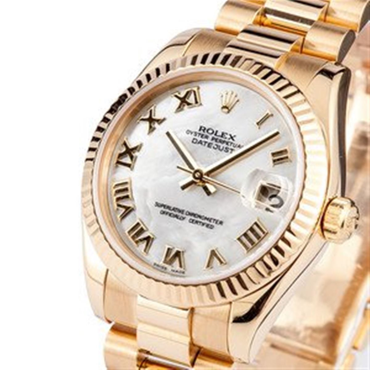 Model/Style-President 178278 Serial/Year-Random Features-Automatic movement w/ date, Quickset, scratch-resistant sapphire crystal, waterproof screw-down crown Case-18k yellow gold w/ fluted bezel, Mid-size 31mm Bracelet-18k yellow gold Presidential #9177