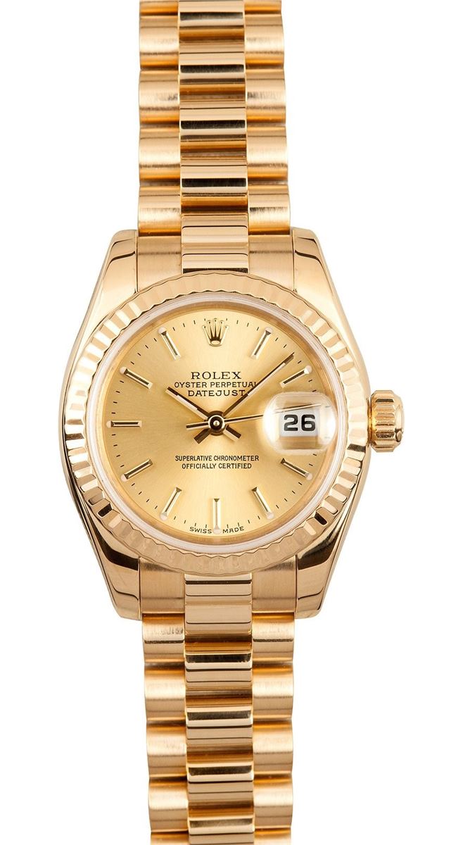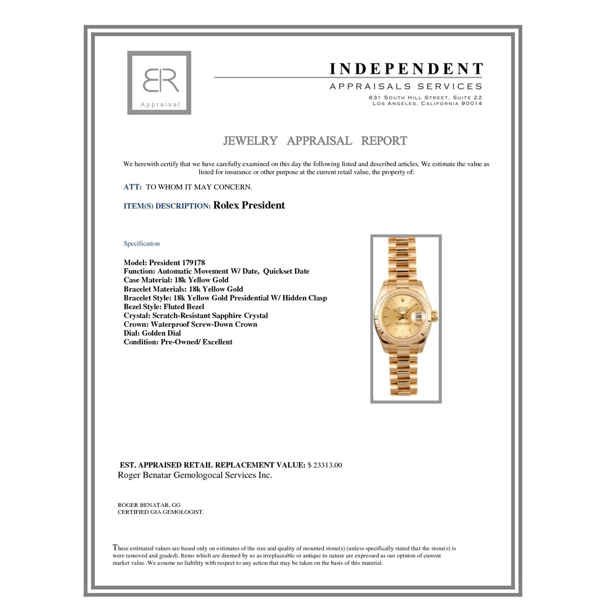 Model/Style-President 179178 Serial/Year-Random Features-Automatic movement w/ date, Quickset date, scratch-resistant sapphire crystal, waterproof screw-down crown Case-18k yellow gold w/ fluted bezel Bracelet-18k yellow gold Presidential w/ hidden clasp #9184