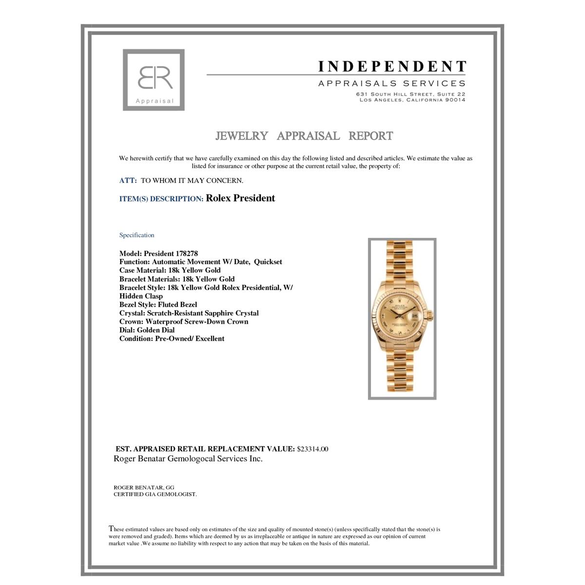 Model/Style-President 179178 Serial/Year-Random Features-Automatic movement w/ date, Quickset date, scratch-resistant sapphire crystal, waterproof screw-down crown Case-18k yellow gold w/ fluted bezel Bracelet-18k yellow gold Presidential w/ hidden clasp #9181