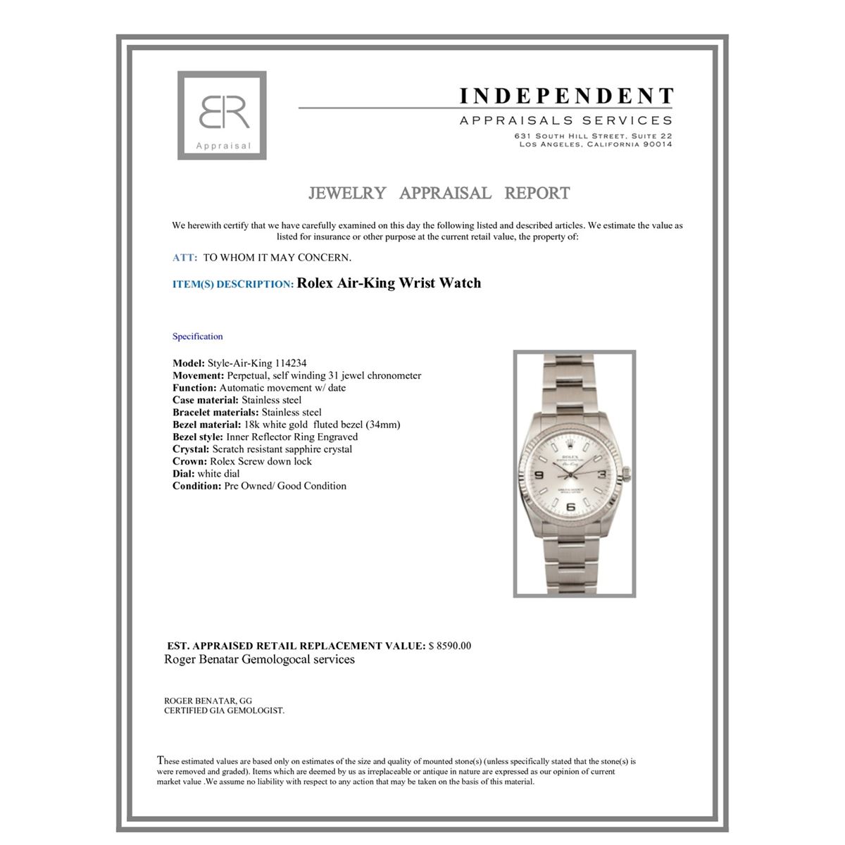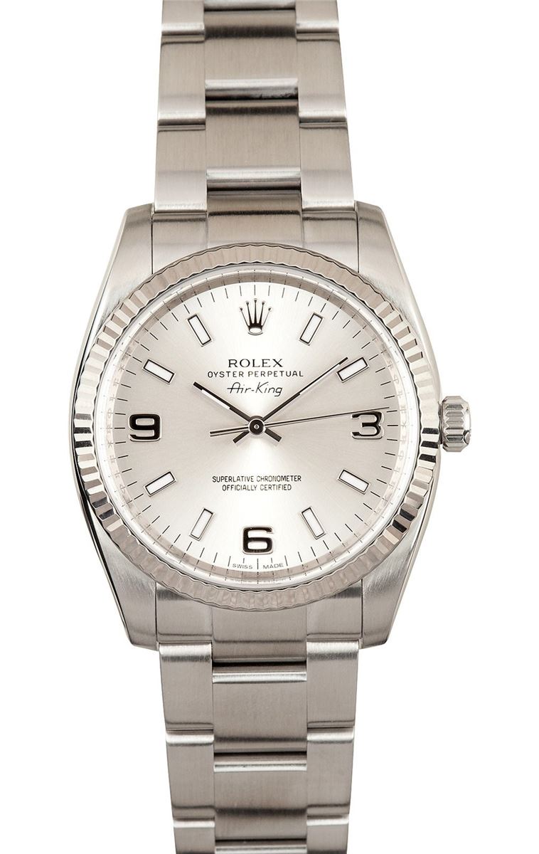 Model/Style-Air-King 114234 Serial/Year-Random Features-Automatic movement w/ date, 31 jewels, scratch resistant sapphire crystal Case-Stainless steel w/ 18k white gold fluted bezel (34mm), inner reflector ring engraved w/ serial number Bracelet-Stainless steel Oyster #9002