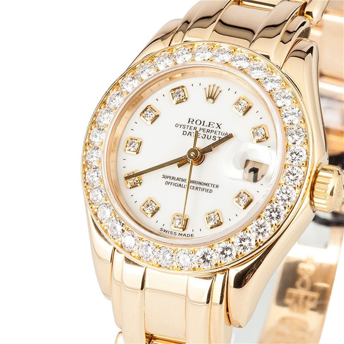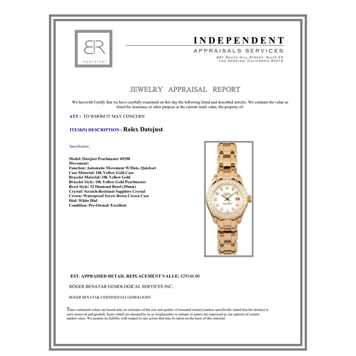 Model/Style-Datejust Pearlmaster 69298 Serial/Year-Random Features-Automatic movement w/ date, Quickset, scratch-resistant sapphire crystal, waterproof screw-down crown Case-18k yellow gold case w/ 32 diamond bezel (29mm) Bracelet-18k yellow gold Pearlmaster #9064
