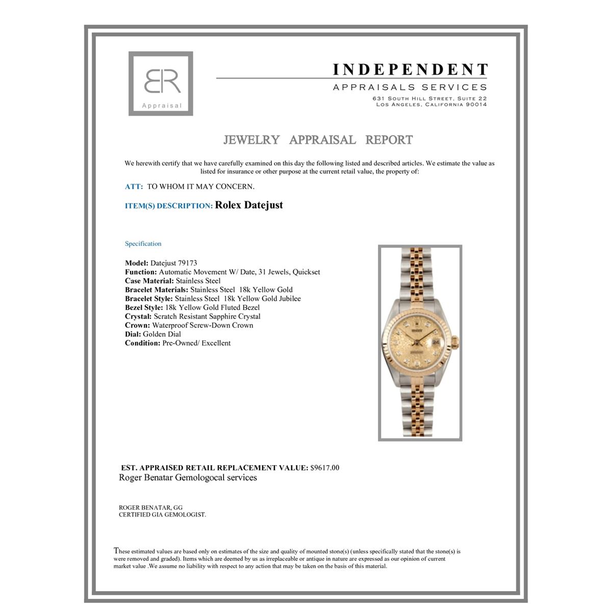 Not all jewelry, watches or loose stones are appraised and the appraisals are provided for bidders only in certain instances at the discretion of the Company. Appraisals, if any should be use to verify gemstone and or metal weights. The appraisals should not be used for valuation of any item. No guarantee, warranty or representation is intended by the Company in any appraisal. All dimensions and weights of such lots are approximate and are consistent with standards and practices in the industry. Condition reports are provided as a service to the prospective buyer. Bidders should take note that such descriptions are not warranties and that watches may need general service, change of battery or further repairs for which the buyer is solely responsible