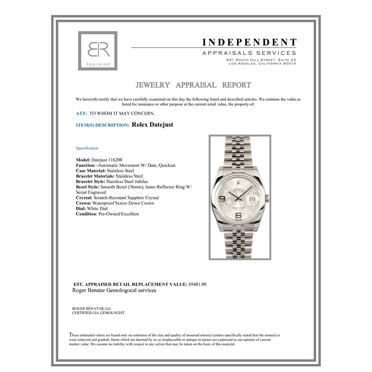Model/Style-Datejust 116200 Serial/Year-Random Features-Automatic movement w/ date, Quickset, scratch-resistant sapphire crystal, waterproof screw-down crown Case-Stainless steel w/ smooth bezel (36mm), inner-reflector ring w/ serial engraved Bracelet-Stainless Steel Jubilee #9031