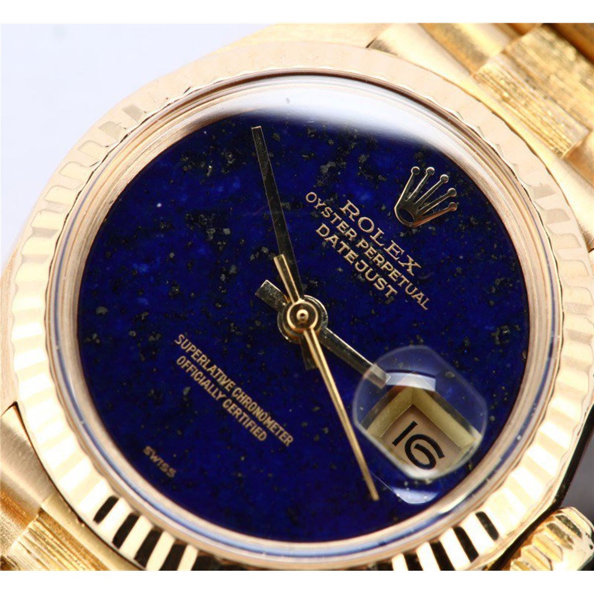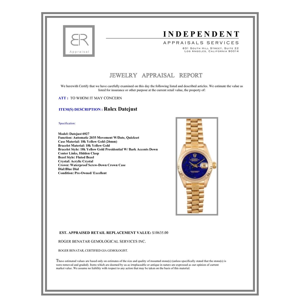 Model/Style-Datejust 6927 Serial/Year-Random Features-Automatic 2035 movement w/ date, Quickset date, acrylic crystal, waterproof screw-down crown Case-18k yellow gold (26mm) w/ fluted bezel Bracelet-18k yellow gold Presidential w/ bark accents down center links, hidden clasp #9057