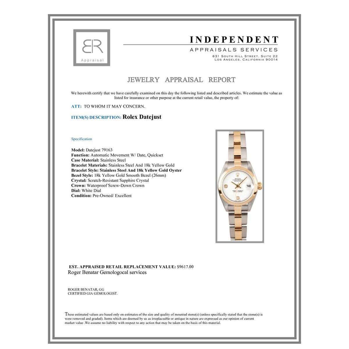 Model/Style-DateJust 79163 Serial/Year-Random Features-Automatic movement w/ date, Quickset, scratch-resistant sapphire crystal, waterproof screw-down crown Case-Stainless steel w/ 18k yellow gold smooth bezel (26mm) Bracelet-Stainless steel and 18k yellow gold Oyster #9042