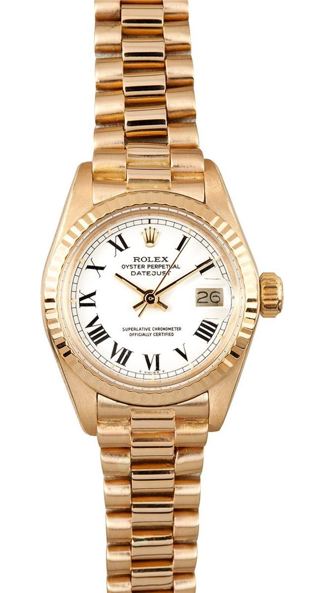 Model/Style-Datejust 6917 Serial/Year-Random Features-Automatic movement w/ date, Quickset date, acrylic crystal, waterproof screw-down crown Case-18k yellow gold (26mm) w/ fluted bezel Bracelet-18K yellow gold President #9062