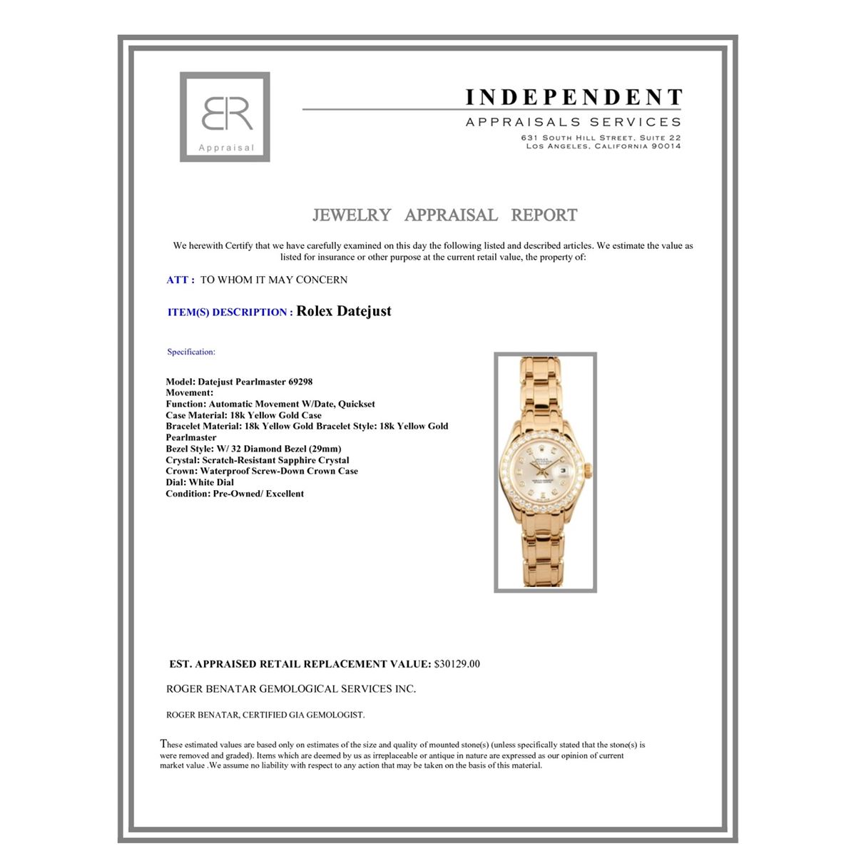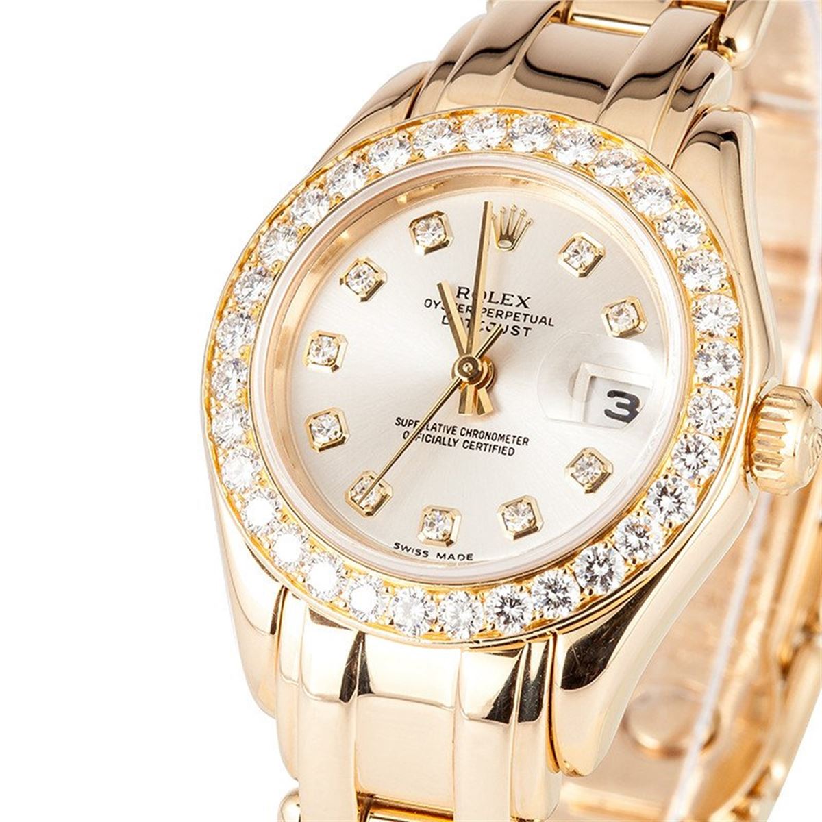 Model/Style-Datejust Pearlmaster 69298 Serial/Year-Random Features-Automatic movement w/ date, Quickset, scratch-resistant sapphire crystal, waterproof screw-down crown Case-18k yellow gold case w/ 32 diamond bezel (29mm) Bracelet-18k yellow gold Pearlmaster #9063