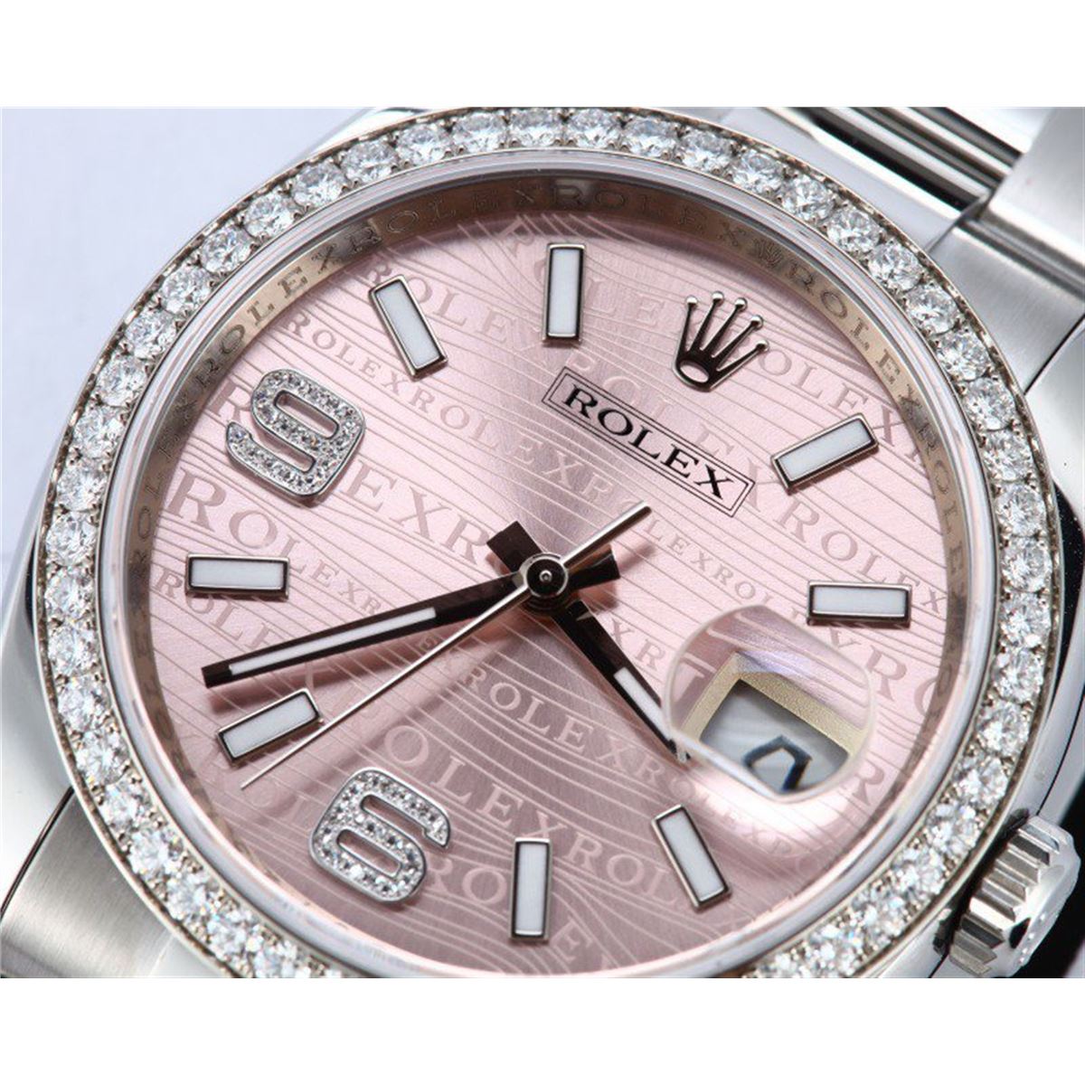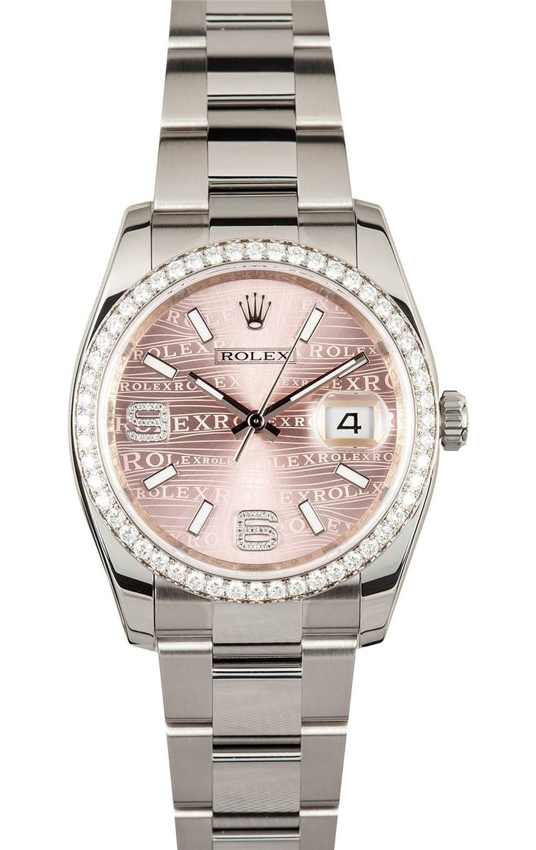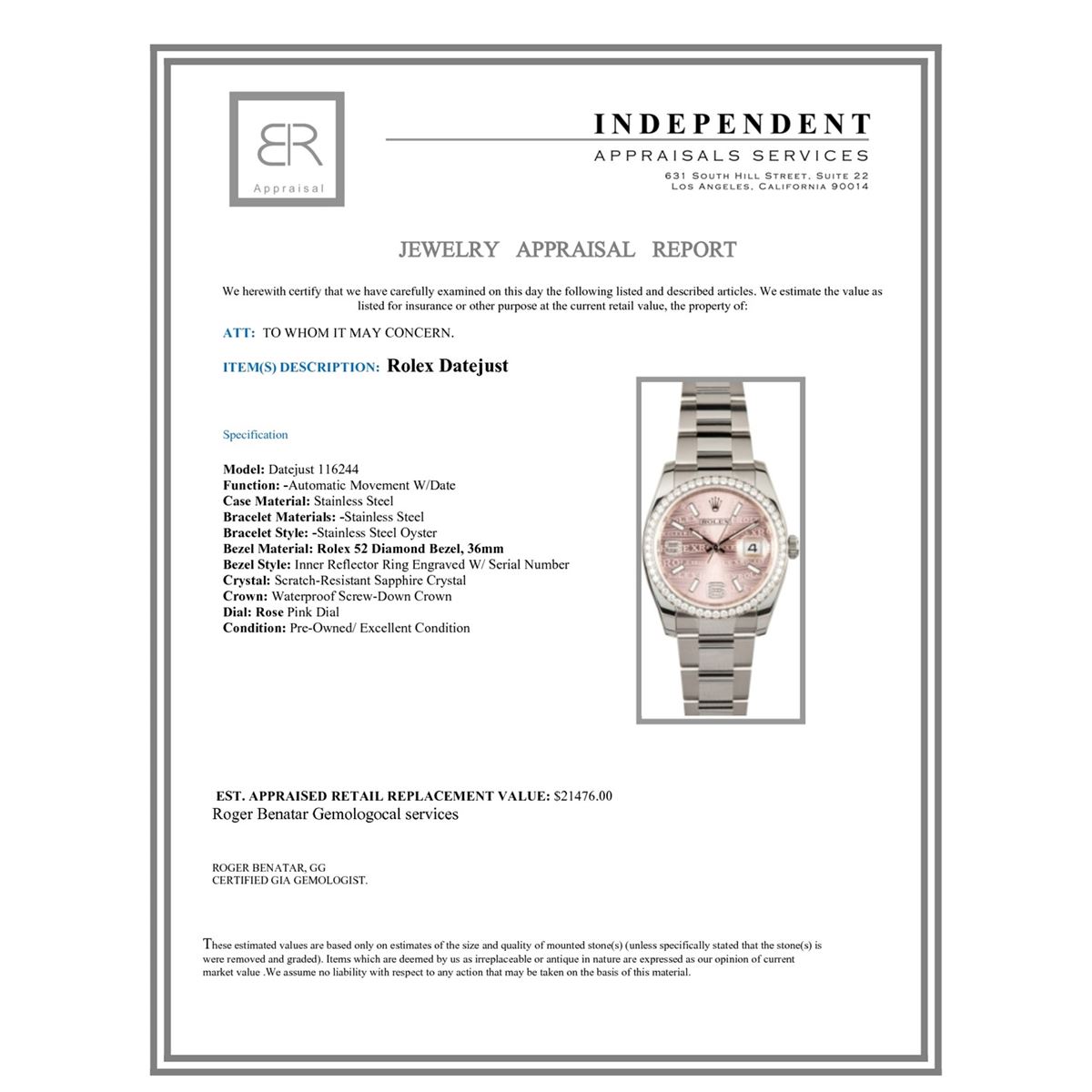Model/Style-Datejust 116244 Serial/Year-Random Features-Automatic movement w/date, scratch-resistant sapphire crystal, waterproof screw-down crown Case-Stainless steel w/ Rolex 52 diamond bezel, 36mm, inner reflector ring engraved w/ serial number Bracelet-Stainless steel Oyster #9026