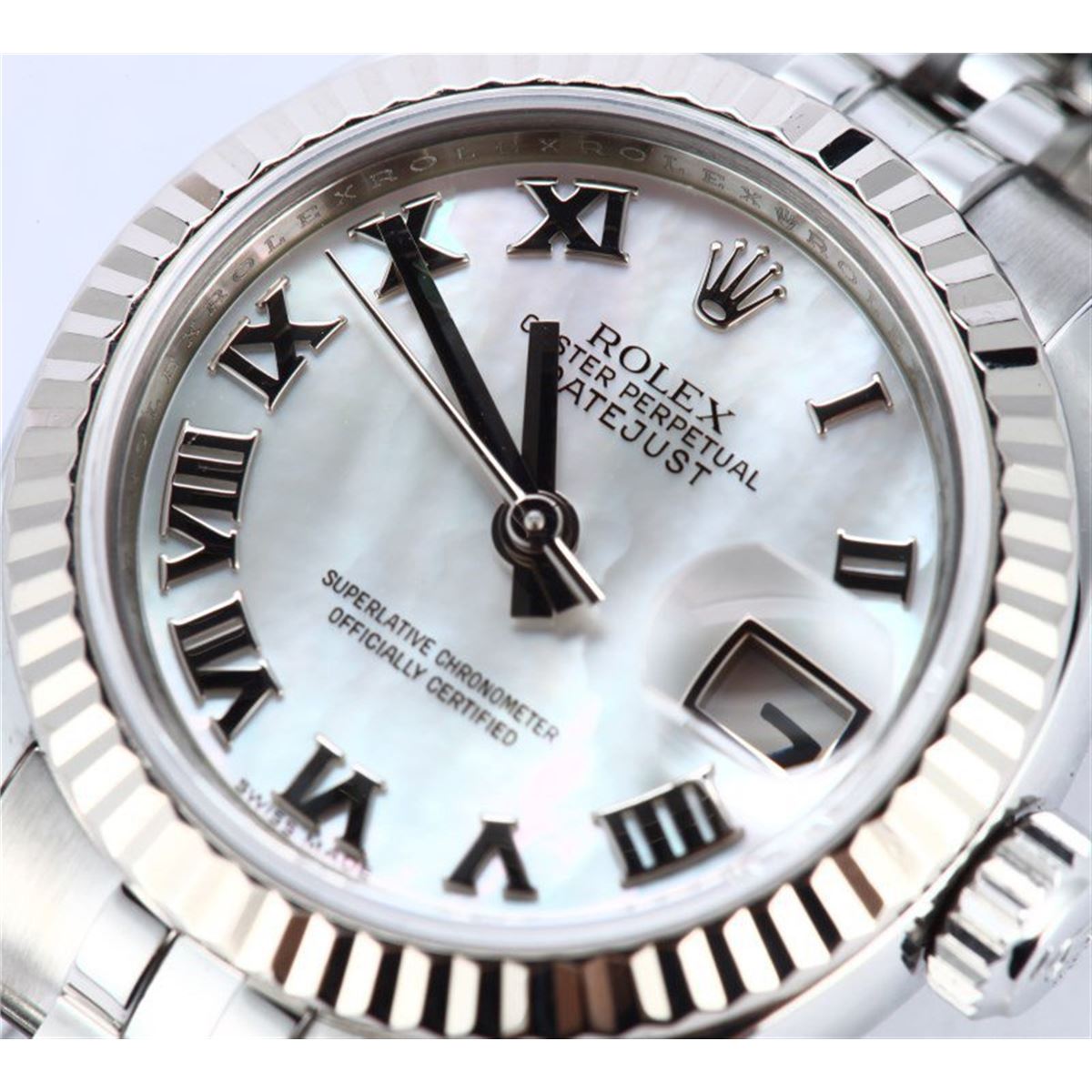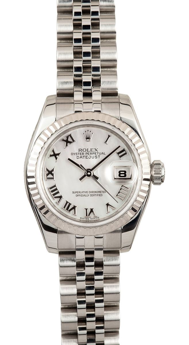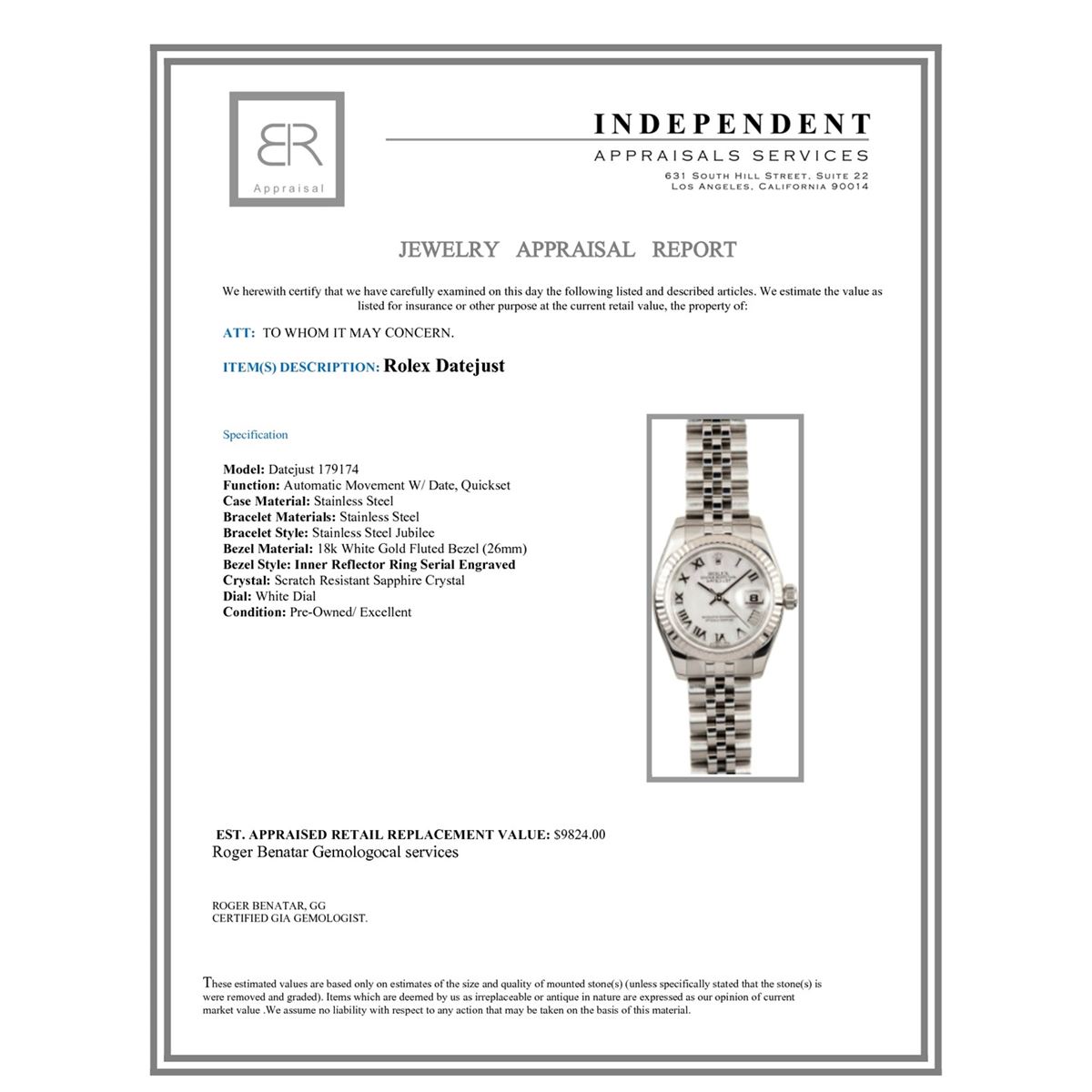 Model/Style-DateJust 179174 Serial/Year-Random Features-Automatic movement w/ date, Quickset, scratch resistant sapphire crystal, inner reflector ring serial engraved Case-Stainless steel w/ 18k white gold fluted bezel (26mm) Bracelet-Stainless steel Jubilee #9046