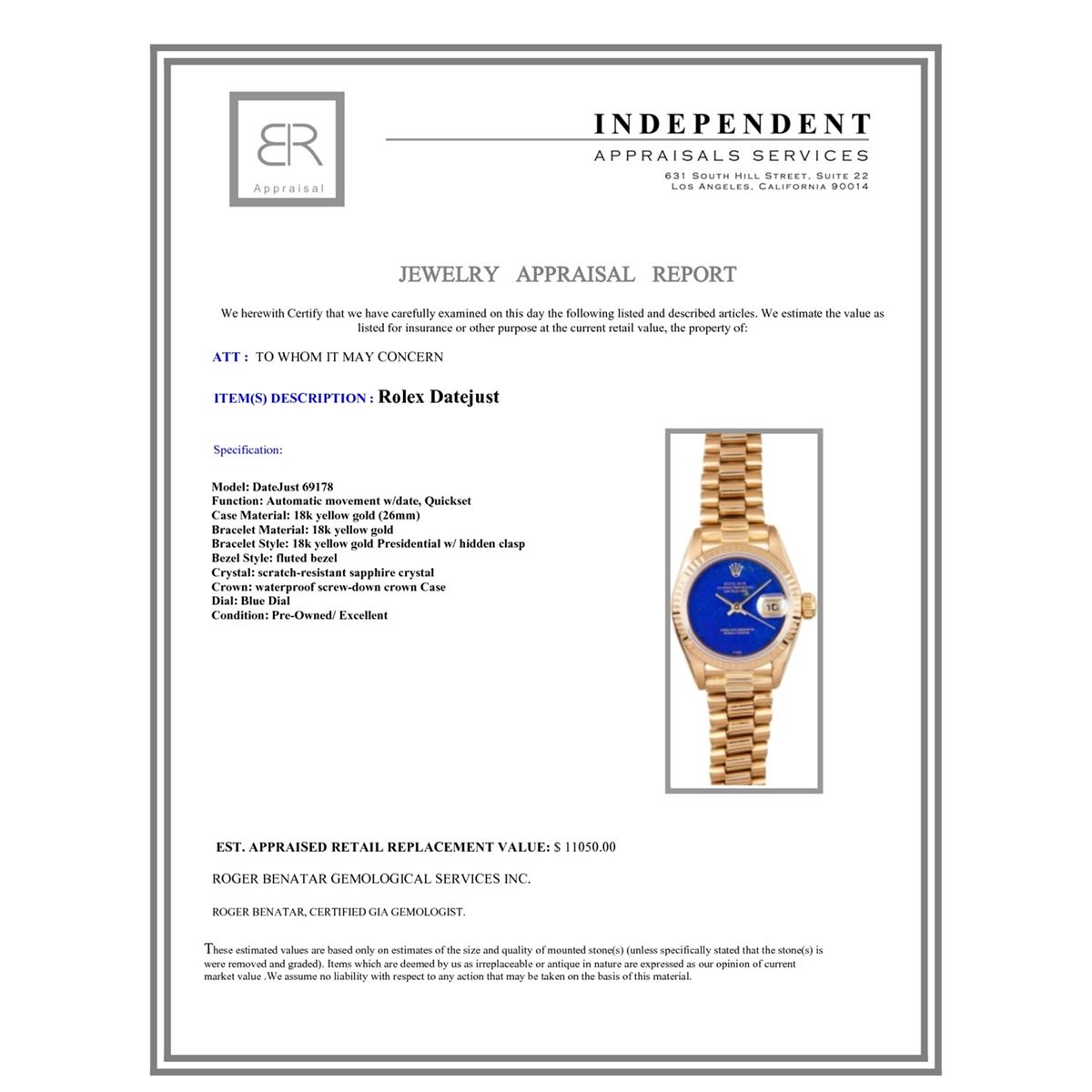 Model/Style-DateJust 69178 Serial/Year-Random Features-Automatic movement w/ date, Quickset date, scratch-resistant sapphire crystal, waterproof screw-down crown Case-18k yellow gold (26mm) w/ fluted bezel Bracelet-18k yellow gold Presidential w/ hidden clasp #9061