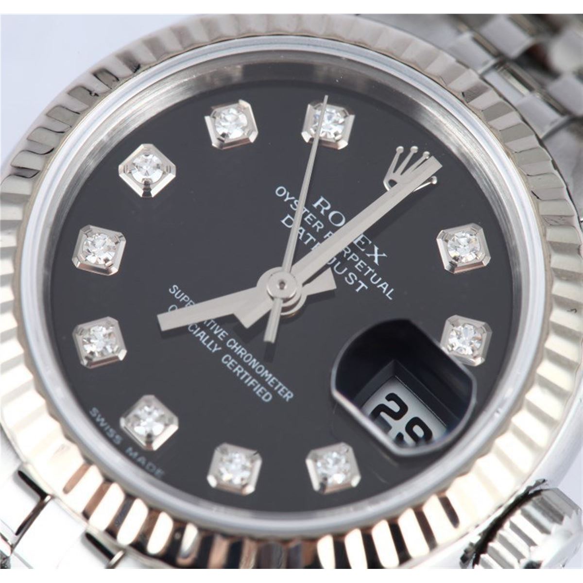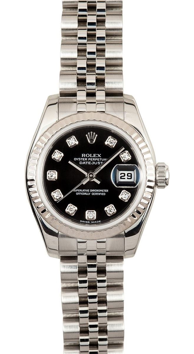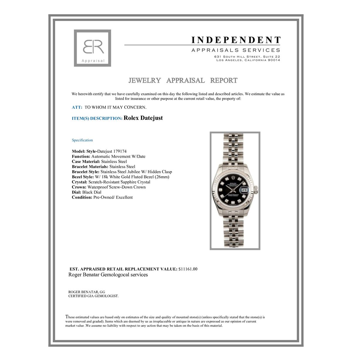 Model/Style-Datejust 179174 Serial/Year-Random Features-Automatic movement w/date, scratch-resistant sapphire crystal, waterproof screw-down crown Case-Stainless steel w/ 18k white gold fluted bezel (26mm) Bracelet-Stainless steel Jubilee w/ hidden clasp #9044