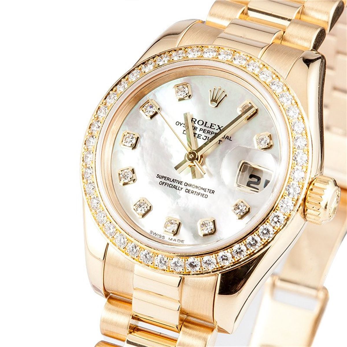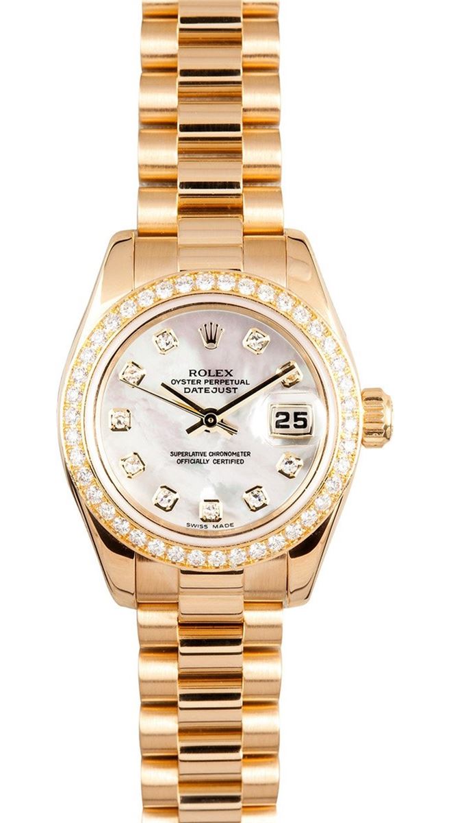 Model/Style-DateJust 179138 Serial/Year-Random Features-Automatic movement, Quickset date, scratch-resistant sapphire crystal, waterproof screw-down crown Case-18k yellow gold w/ diamond bezel (26mm) Bracelet-18k yellow gold Rolex President w/ hidden clasp #9058