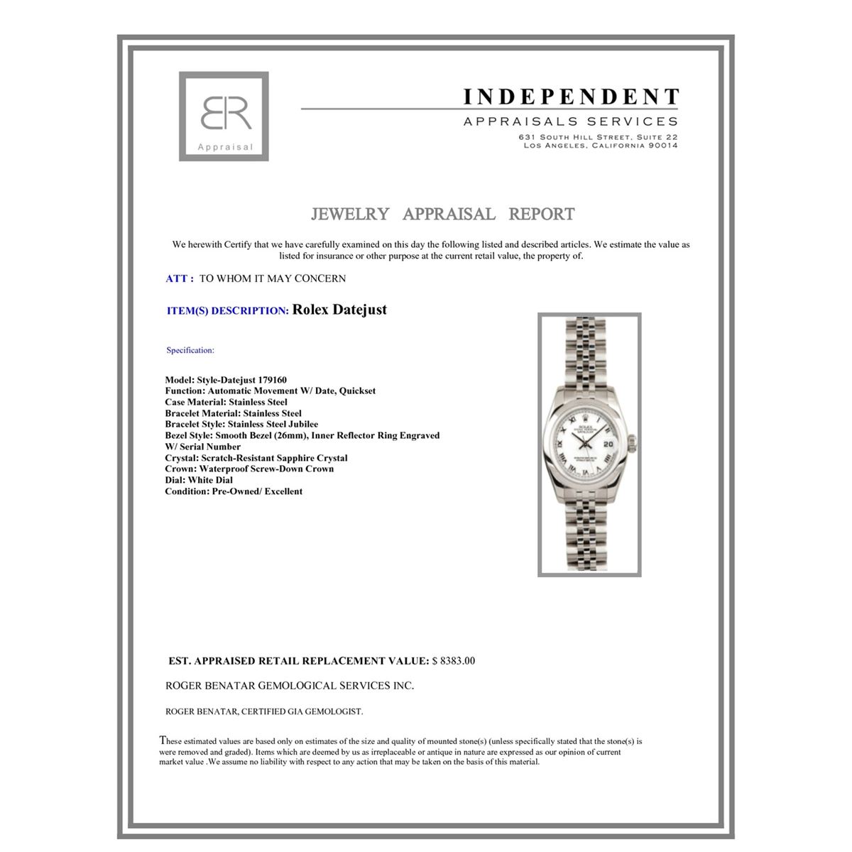 Model/Style-DateJust 179160 Serial/Year-Random Features-Automatic movement w/ date, Quickset, scratch-resistant sapphire crystal, waterproof screw-down crown Case-Stainless steel w/ smooth bezel (26mm), inner reflector ring engraved w/ serial number Bracelet-Stainless steel Jubilee #9050