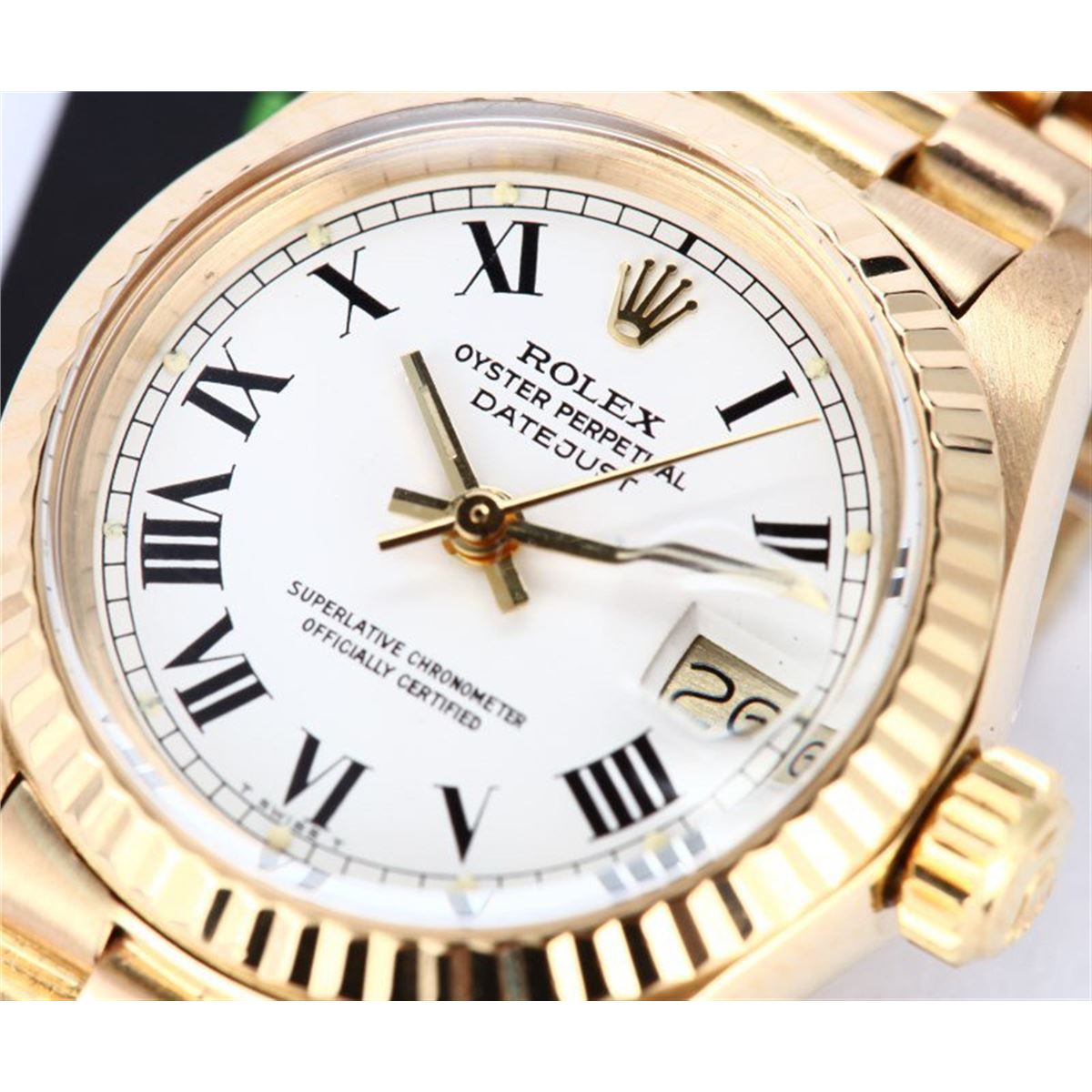 Model/Style-Datejust 6917 Serial/Year-Random Features-Automatic movement w/ date, Quickset date, acrylic crystal, waterproof screw-down crown Case-18k yellow gold (26mm) w/ fluted bezel Bracelet-18K yellow gold President #9062