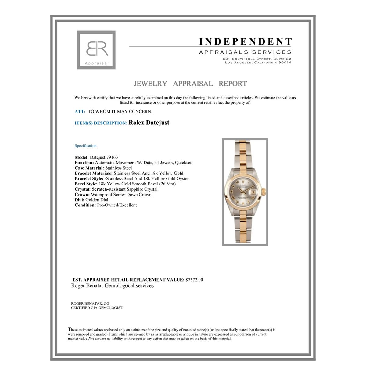 Model/Style-DateJust 79163 Serial/Year-Random Features-Automatic movement w/ date, 31 jewels, Quickset, scratch-resistant sapphire crystal, waterproof screw-down crown Case-Stainless steel with 18k yellow gold smooth bezel (26 mm) Bracelet-Stainless steel and 18k yellow gold Oyster #9043