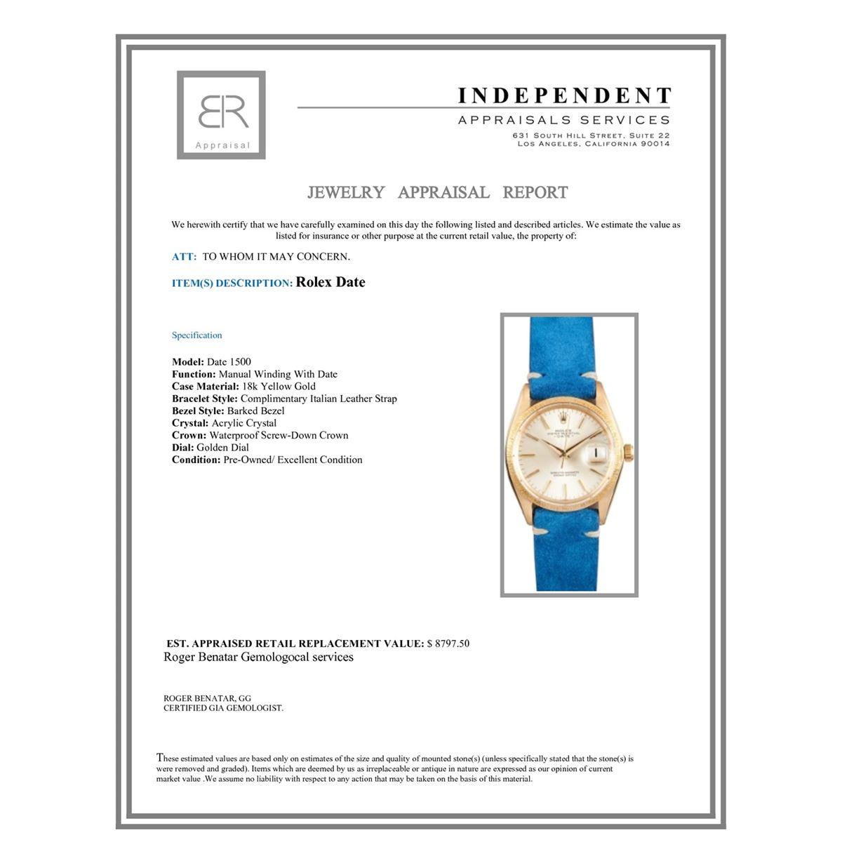 Model/Style-Date 1500 Serial/Year-Random Features-Manual winding with date, acrylic crystal, waterproof screw-down crown Case-18k Yellow Gold w/ barked bezel Bracelet-Complimentary Italian leather strap (other strap options available at no cost to customer) #9014