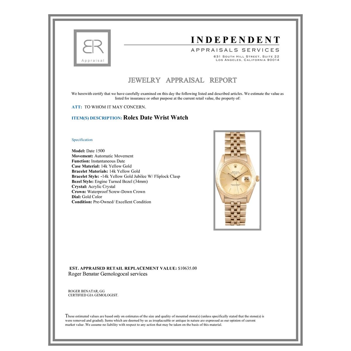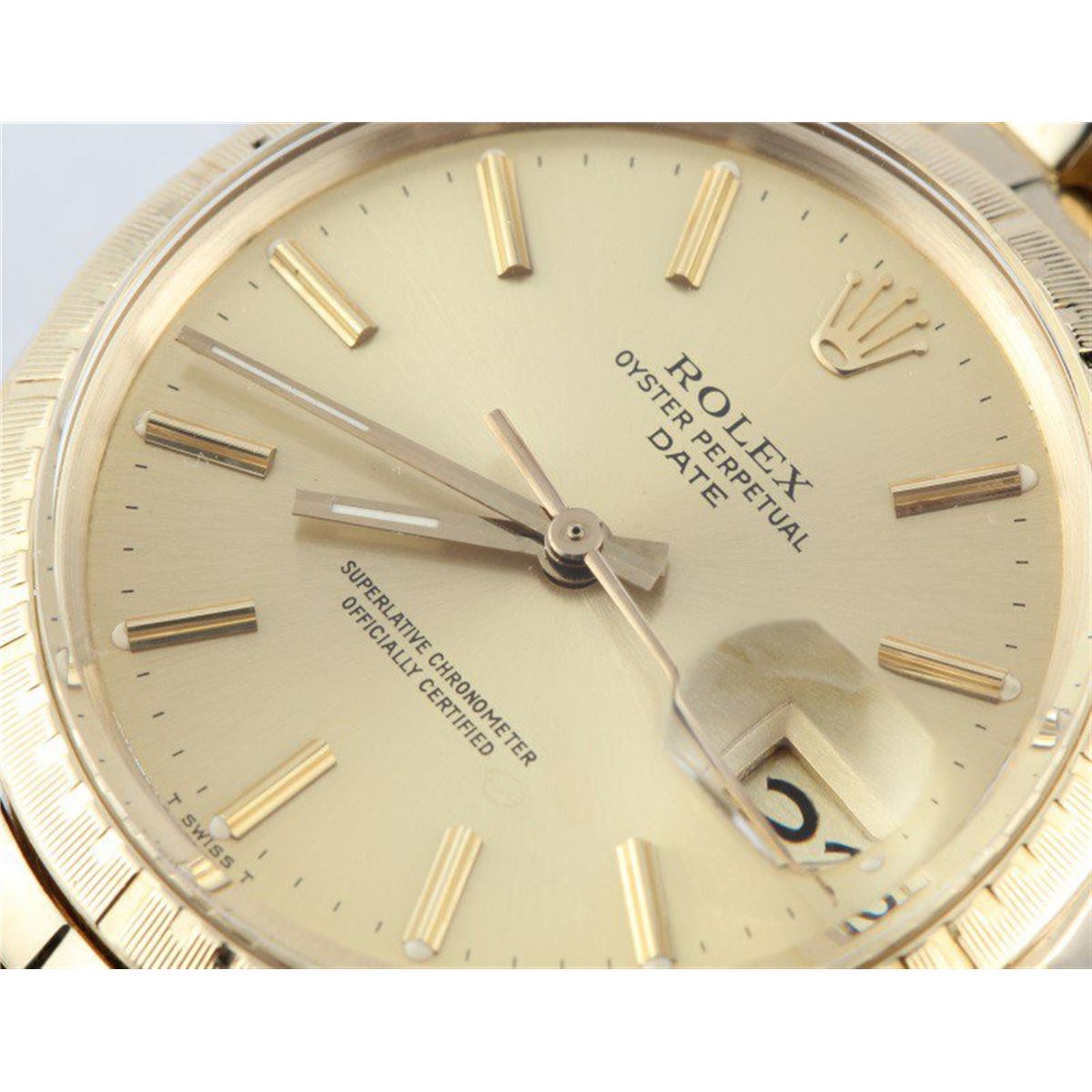 Model/Style-Date 1500 Serial/Year-Random Features-Automatic movement w/ date, acrylic crystal, waterproof screw-down crown Case-14k Yellow Gold w/ engine turned bezel (34mm) Bracelet-14k Yellow Gold Jubilee w/ fliplock clasp #9012