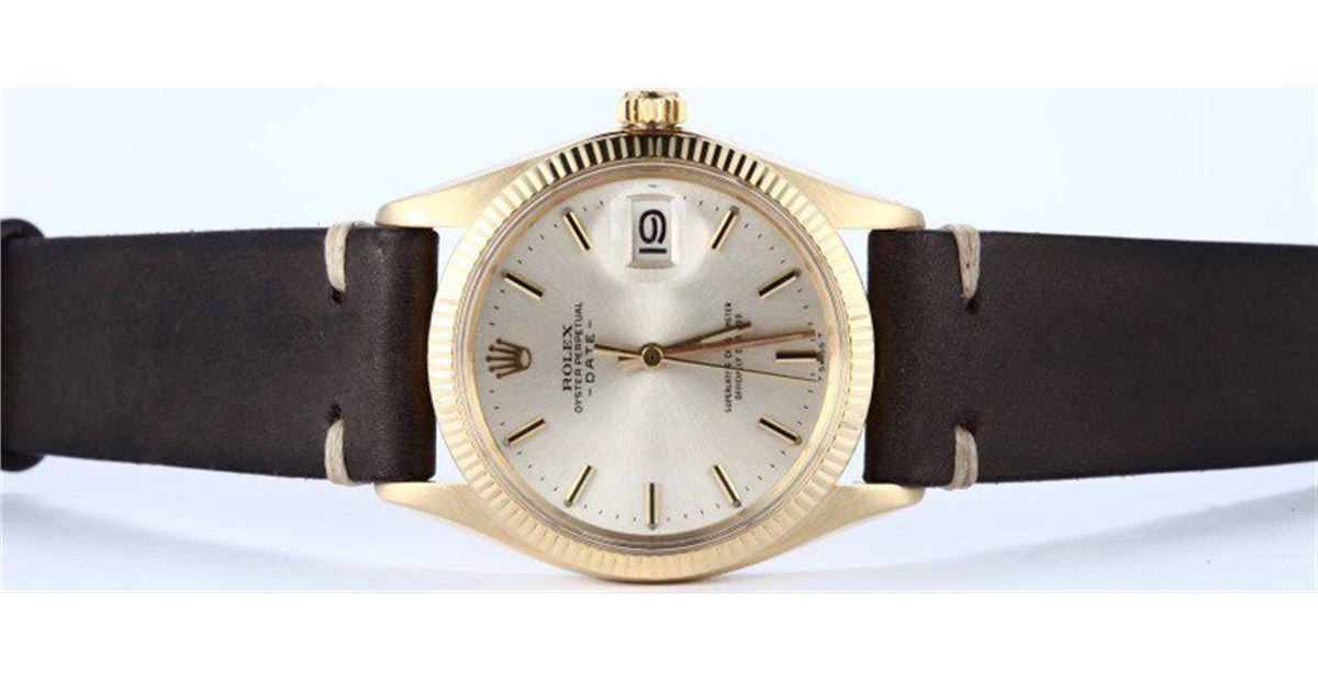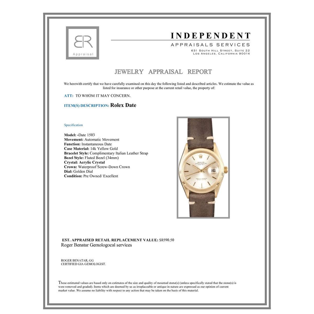 Model/Style-Date 1503 Serial/Year-Random Features-Automatic movement w/ date, waterproof screw-down crown, acrylic crystal Case-14k yellow gold w/ fluted bezel (34mm) Bracelet-Complimentary Italian leather strap #9015