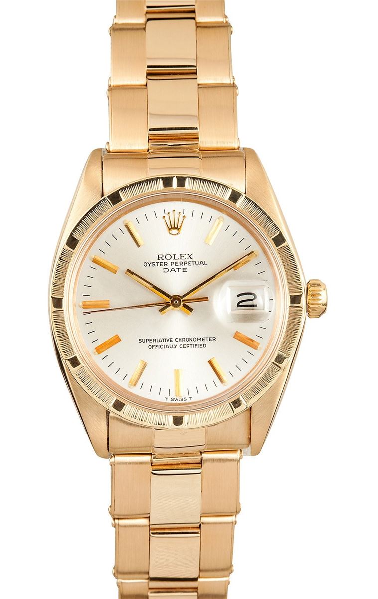 Model/Style-Date 1503 Serial/Year-Random Features-Automatic movement w/ date, waterproof screw-down crown, acrylic crystal Case-18k yellow gold w/ engine turned bezel (34mm) Bracelet-18K yellow gold Oyster Rivet (13 links) #9013
