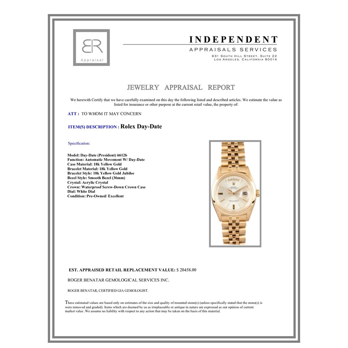 Model/Style-Day-Date (President) 6612B Serial/Year-Random Features-Automatic movement w/ day-date, acrylic crystal, waterproof, screw-down crown Case-18k yellow gold w/ smooth bezel (36mm) Bracelet-18K Yellow Gold Jubilee #9071