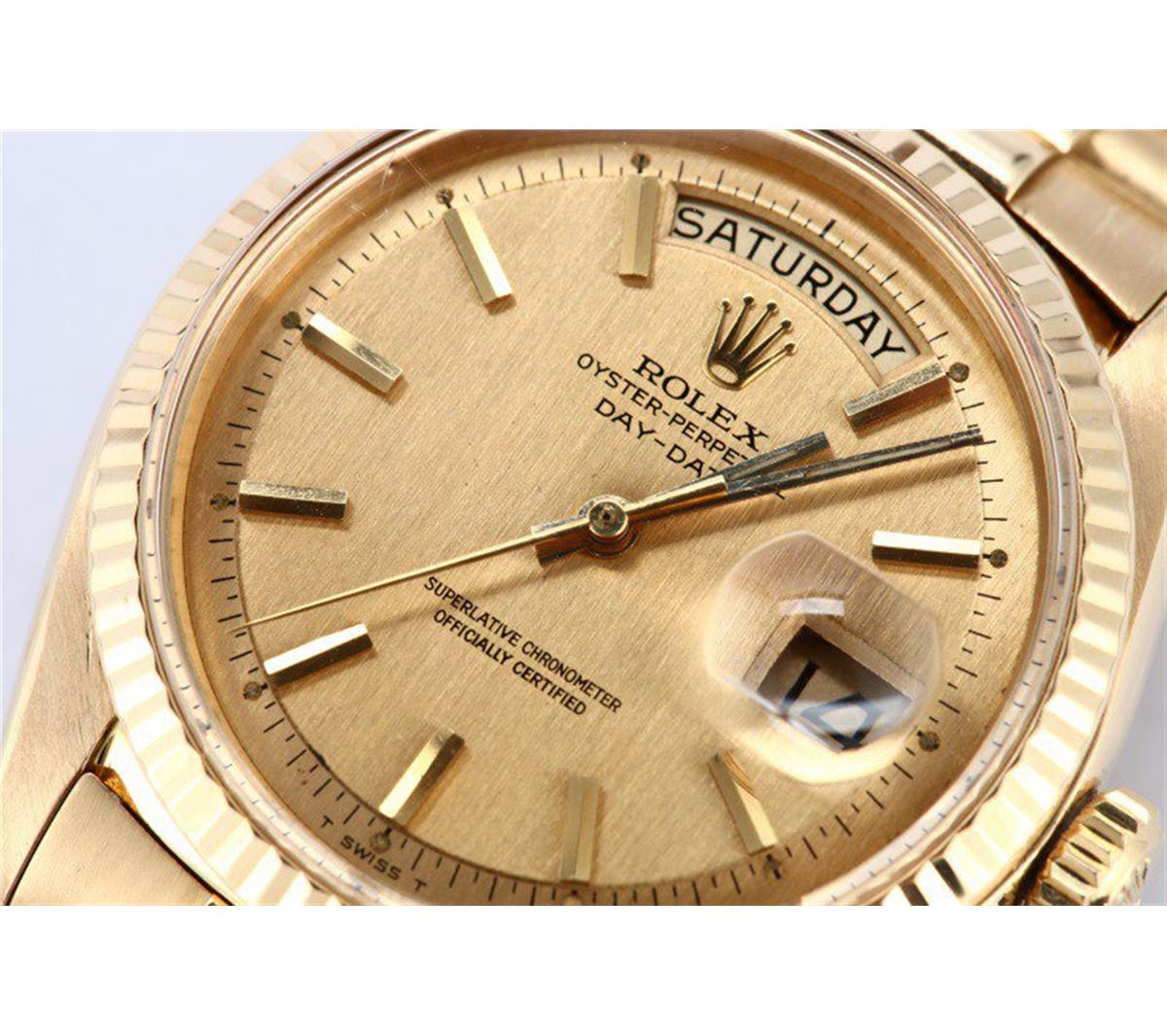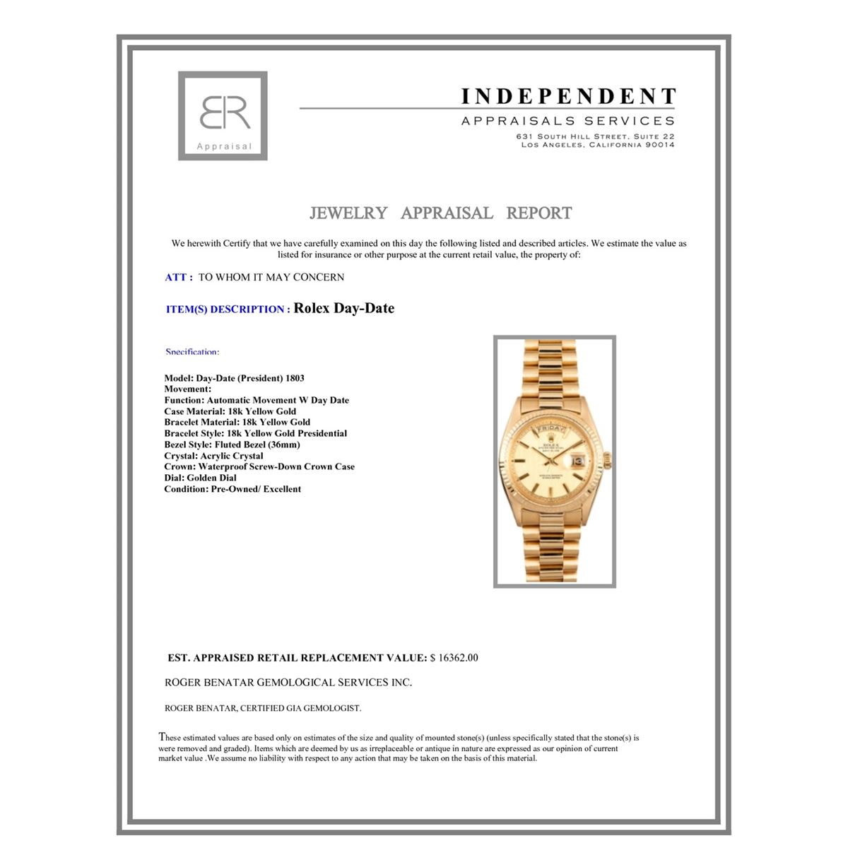 Model/Style-Day-Date (President) 1803 Serial/Year-Random Features-Automatic movement w/ day-date, acrylic crystal, waterproof screw-down crown Case-18K Yellow gold w/ fluted bezel (36mm) Bracelet-18K Yellow Gold Presidential #9067