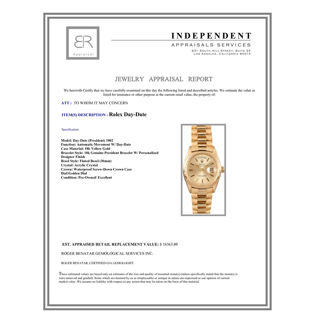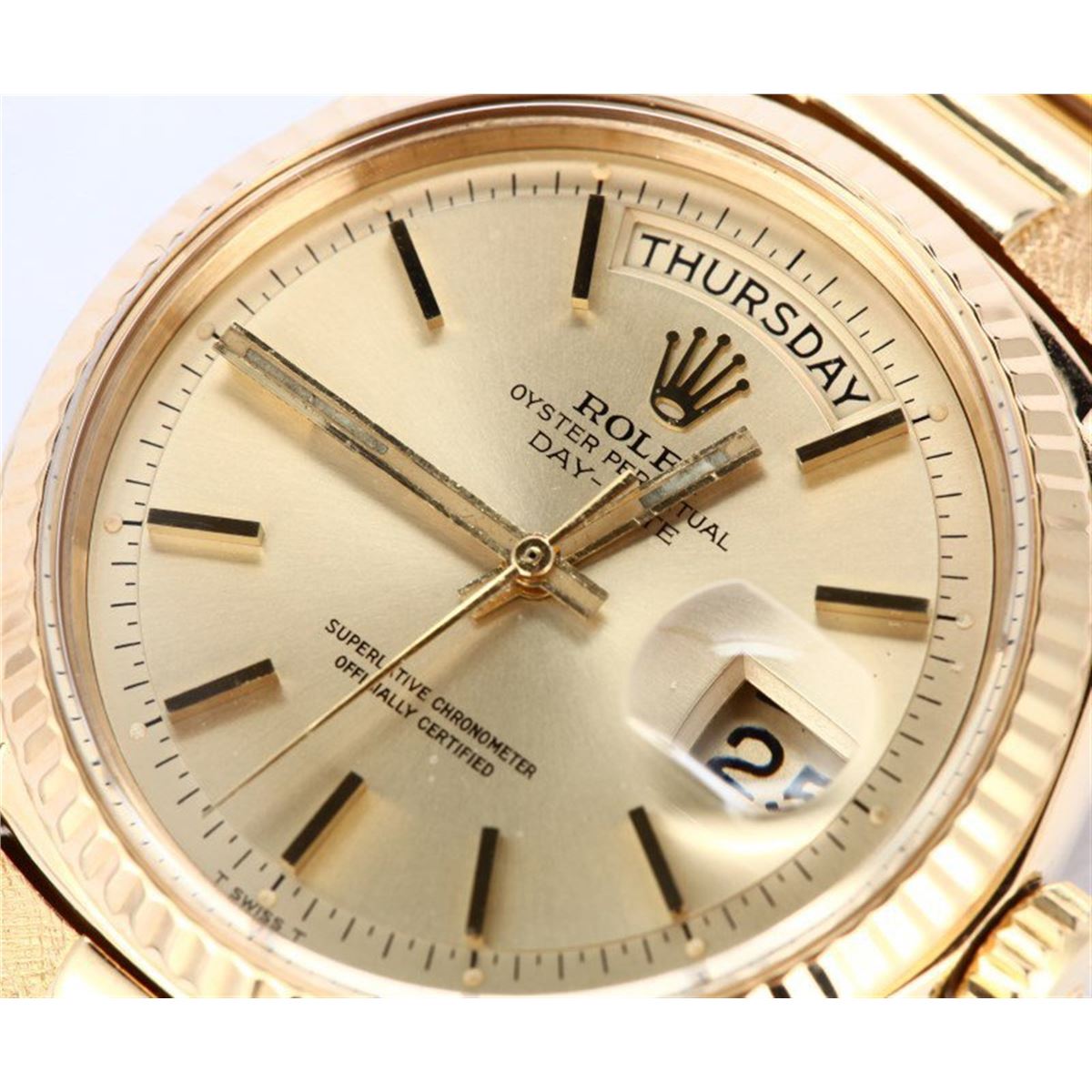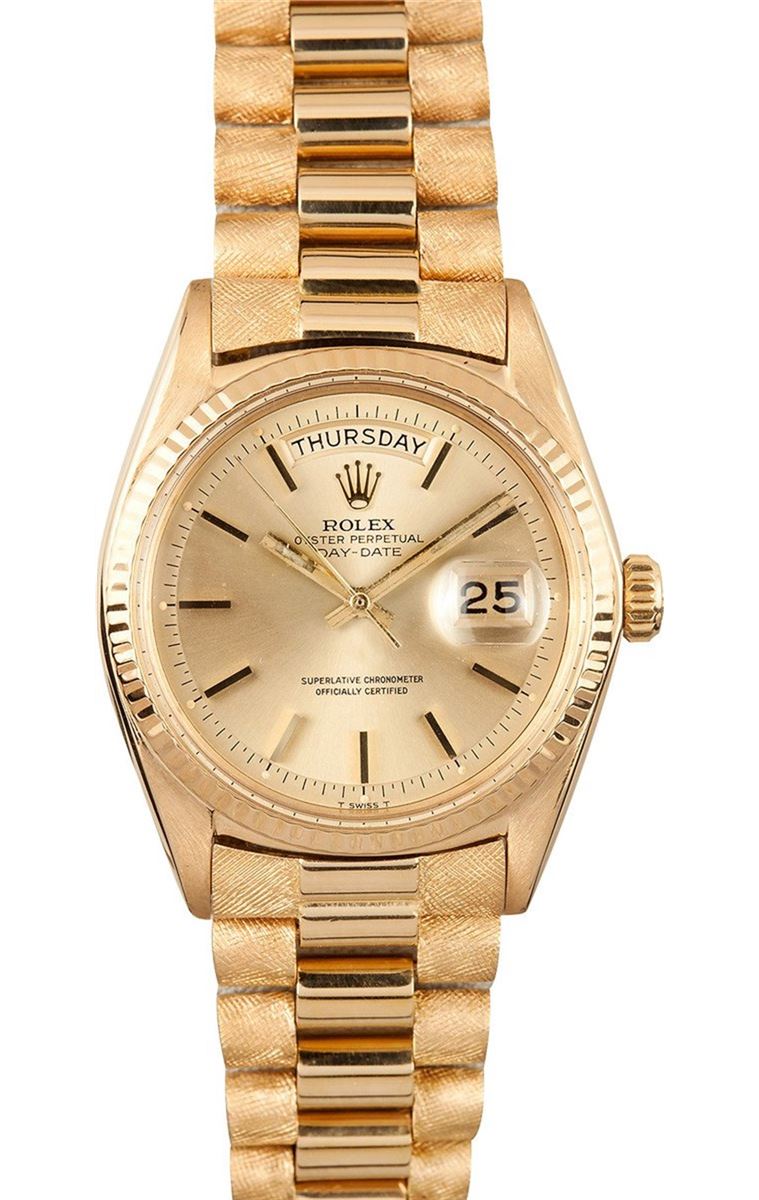 Model/Style-Day-Date (President) 1802 Serial/Year-Random Features-Automatic movement w/ day-date, acrylic crystal, waterproof screw-down crown Case-18K Yellow gold w/ fluted bezel (36mm) Bracelet-18K genuine president bracelet w/ personalized designer finish #9070