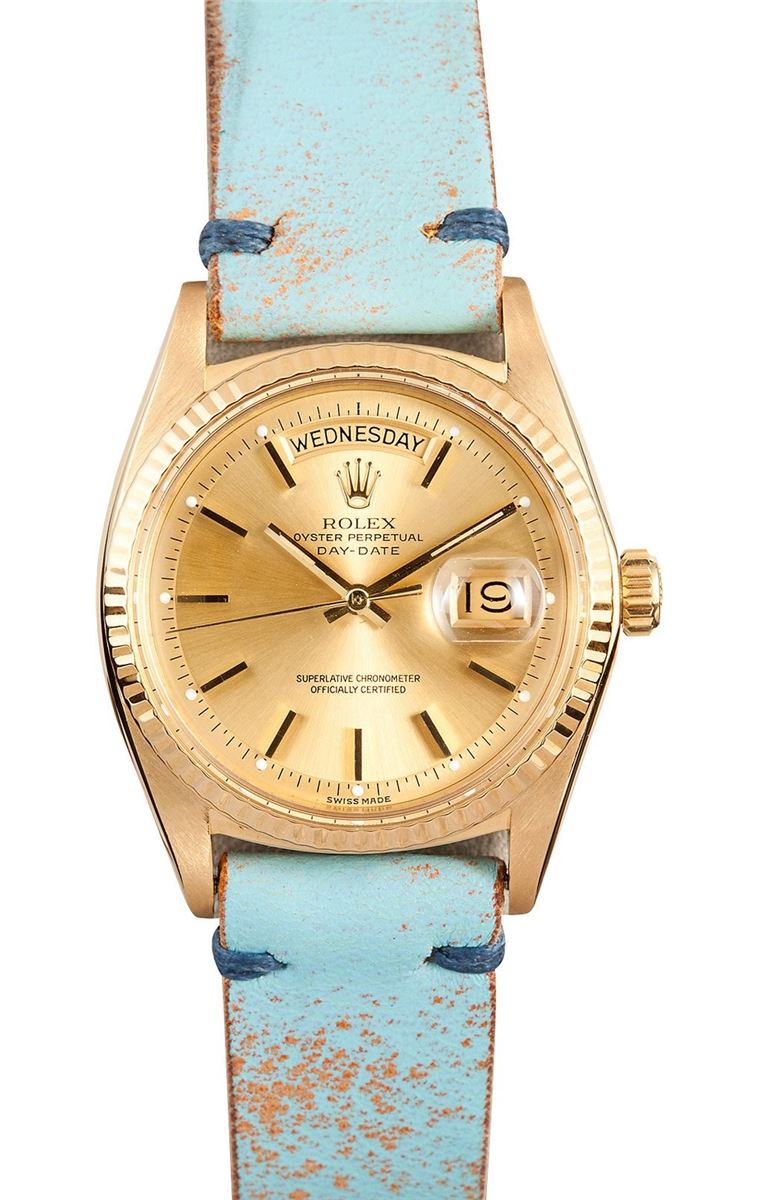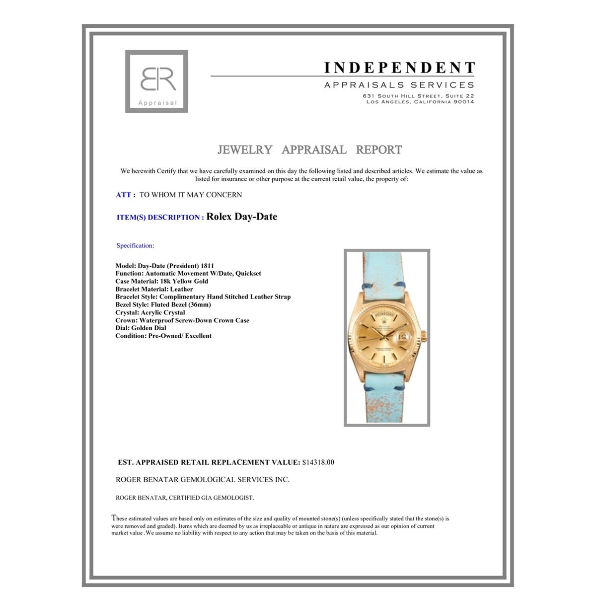 Model/Style-Day-Date (President) 1811 Serial/Year-Random Features-Automatic movement w/ day-date, acrylic crystal, waterproof screw-down crown Case-18k yellow gold w/ fluted bezel (36mm) Bracelet-Complimentary hand stitched leather strap (other strap options available at no cost to customer) #9066