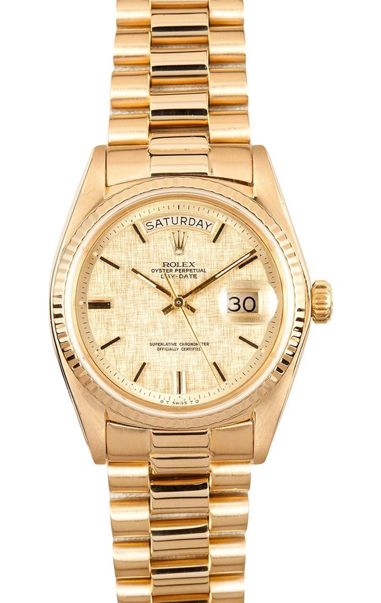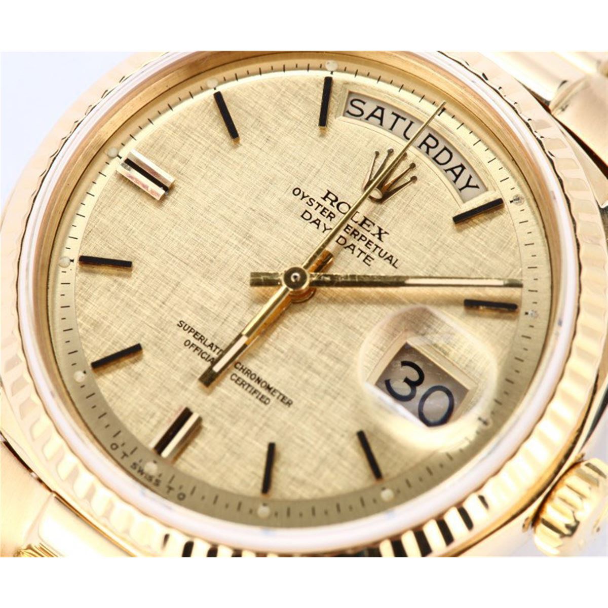 Model/Style-Day-Date 1803 Serial/Year-Random Features-Automatic movement with day-date, waterproof screw-down crown, acrylic crystal Case-18k yellow gold w/ fluted bezel (36mm) Bracelet-18K yellow gold President w/ hidden clasp. Bracelet is in excellent condition with minimal stretch. #9068