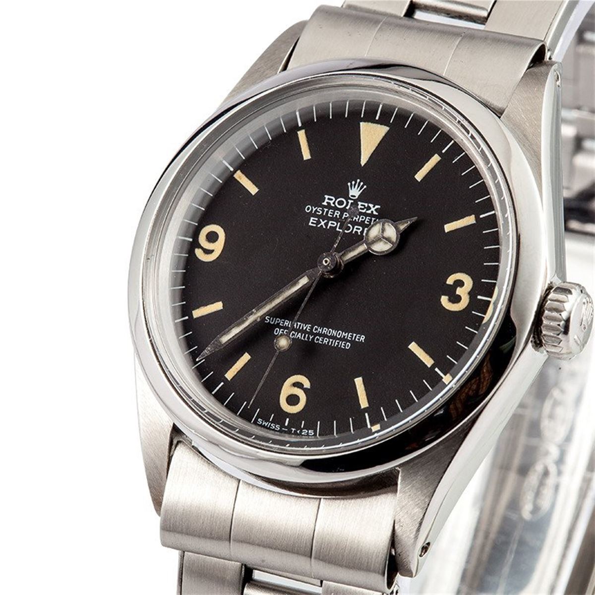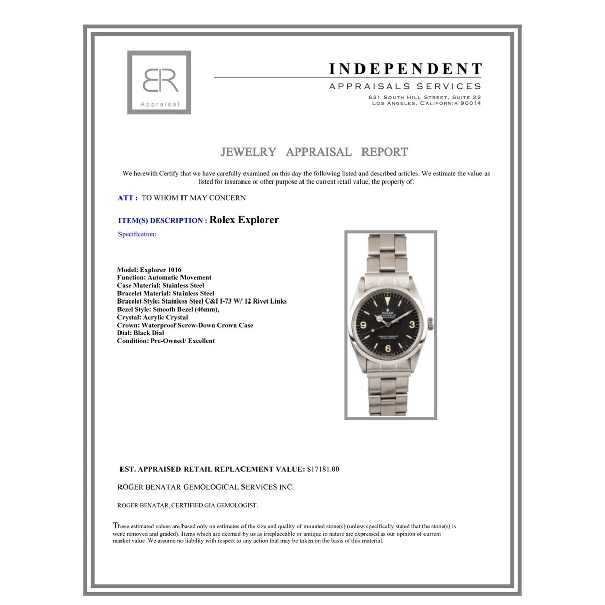 Model/Style-Explorer 1016 Serial/Year-Random Features-Automatic movement, acrylic crystal, waterproof screw-down crown Case-Stainless steel w/ smooth bezel (40mm). Case is in excellent condition. Bracelet-Stainless Steel C&I I-73 w/ 12 rivet links #9074