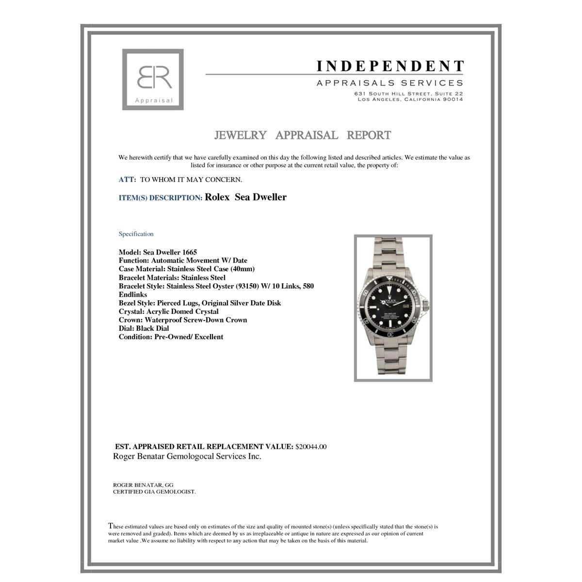 Model/Style-Sea Dweller 1665 Serial/Year-Random Features-Automatic movement w/date, acrylic domed crystal, pierced lugs, original silver date disk Case-Stainless steel case (40mm). Case is in excellent condition with sharp beveled edges. Bracelet-Stainless steel Oyster (93150) w/ 10 links, 580 endlinks. Bracelet has minimal stretch and is in excellent condition. #9186
