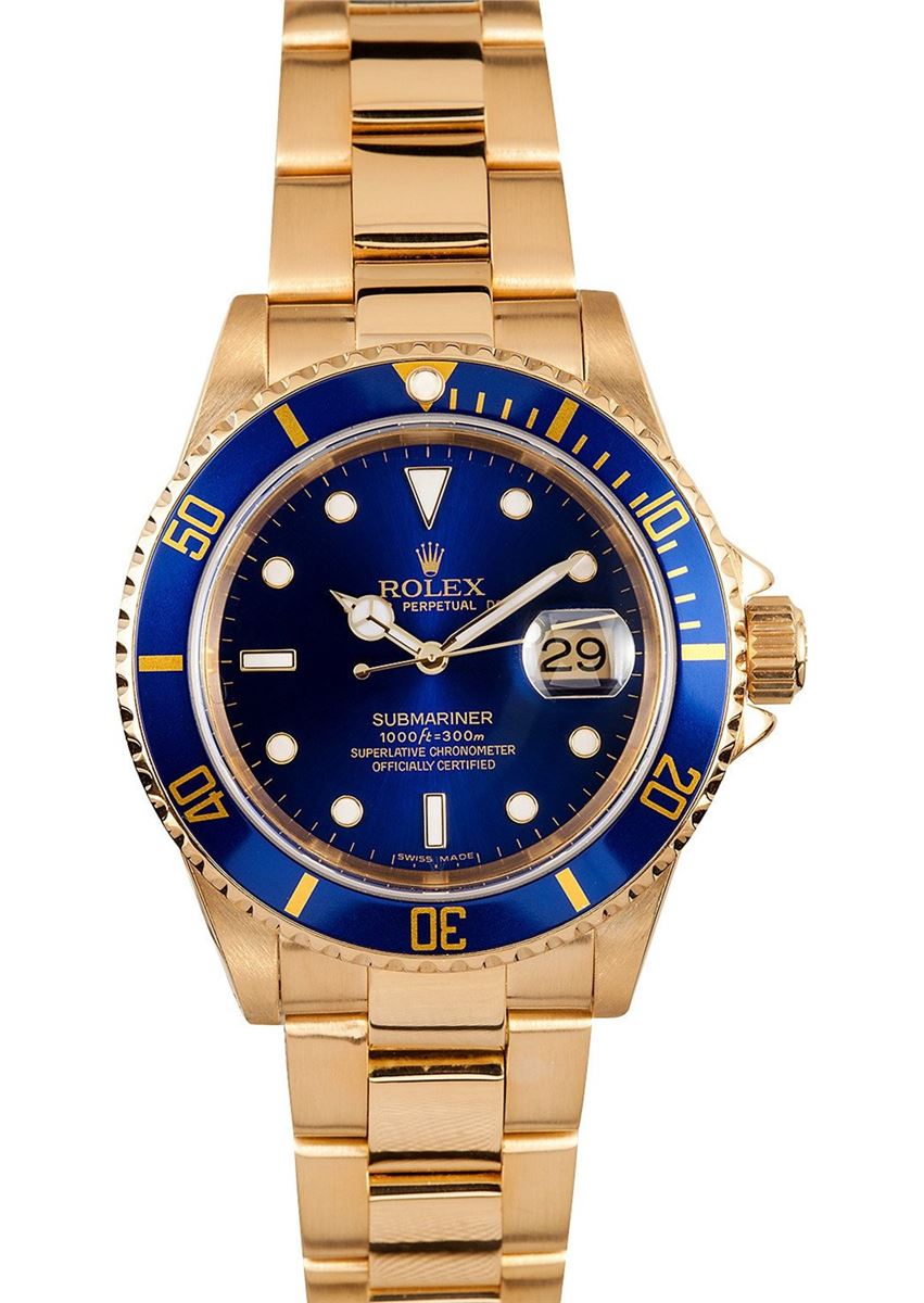 Model/Style-Submariner 16618 Serial/Year-Random Features-Automatic movement w/ date, waterproof screw-down crown, unidirectional rotatable diver's bezel, scratch-resistant sapphire crystal Case-18k yellow gold (40mm) w/ blue bezel insert Bracelet-18k yellow gold Oyster #9244