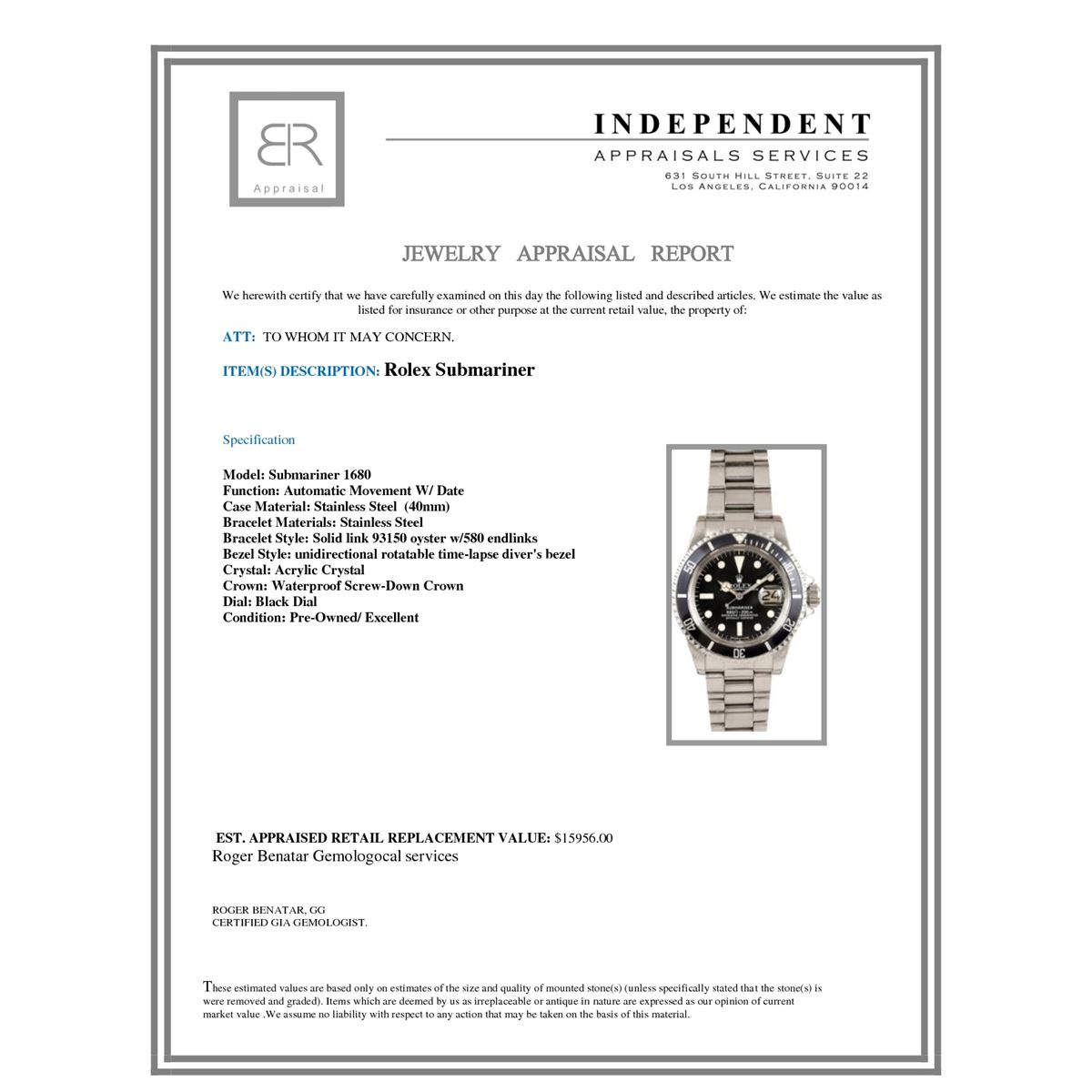 Model/Style-Submariner 1680 Serial/Year-Random Features-Automatic movement w/ date, water resistant, unidirectional rotatable time-lapse diver's bezel, acrylic crystal Case-Stainless steel case (40mm). Case is unpolished and retains the original sharp beveled edges as well as the original fat font insert. Water resistant with screw down crown. Bracelet-Solid link 93150 oyster w/580 endlinks. Bracelet shows minimal stretch and is in excellent condition. #9289