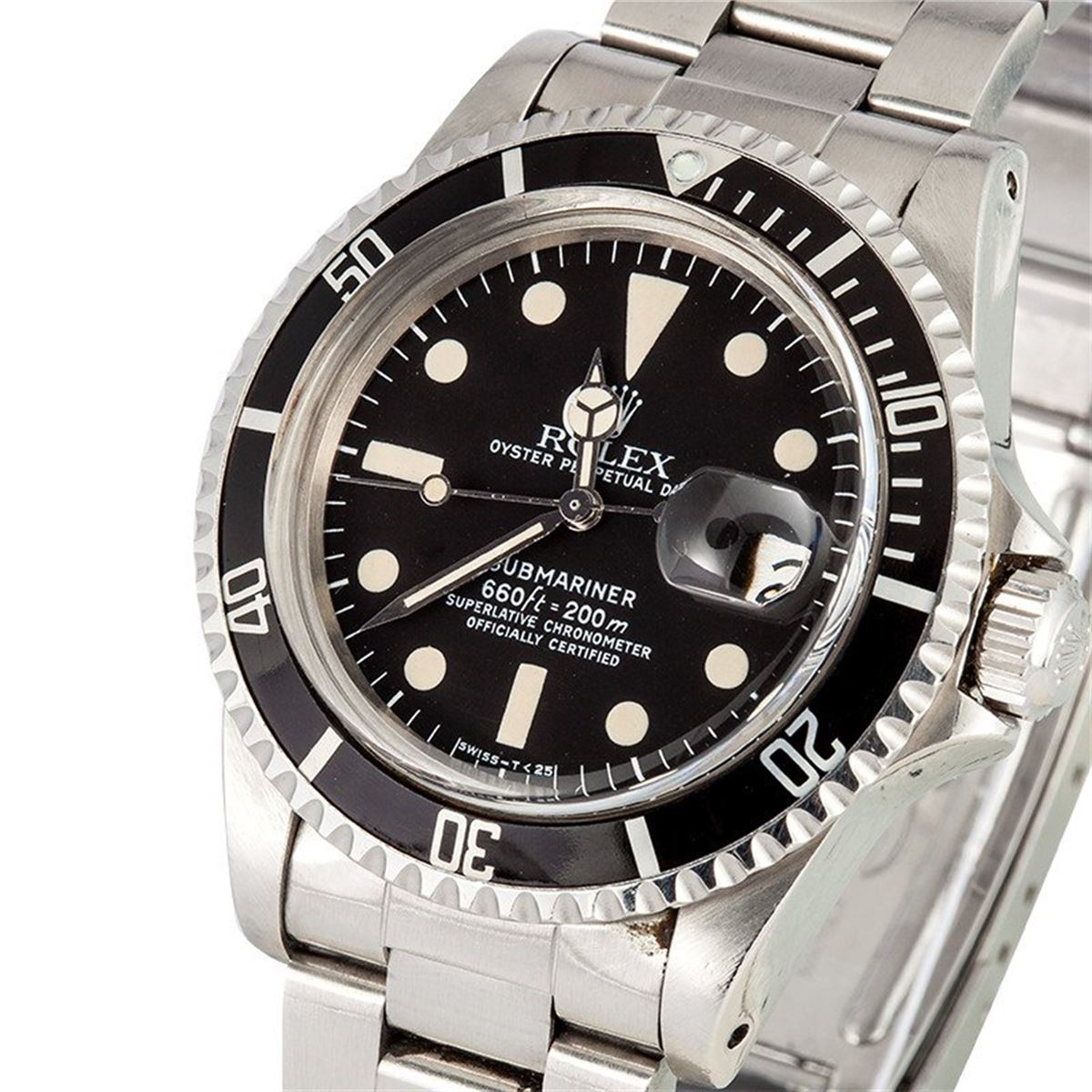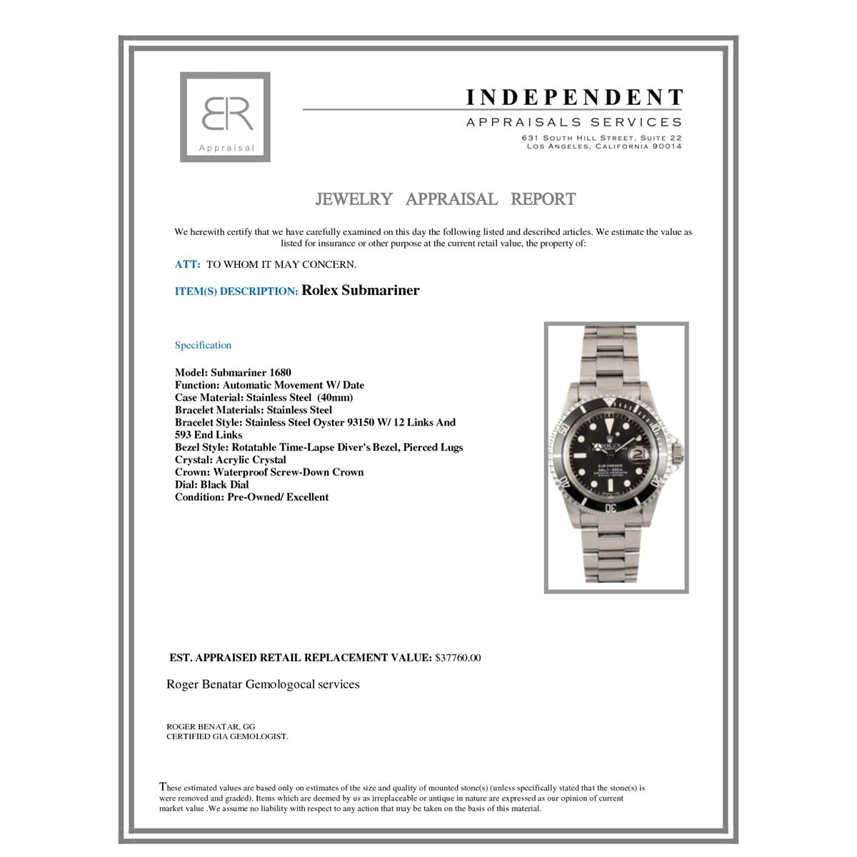 Model/Style-Submariner 1680 Serial/Year-Random Features-Automatic movement w/ date, waterproof screw-down crown, rotatable time-lapse diver's bezel, acrylic crystal Case-Stainless steel (40mm), pierced lugs Bracelet-Stainless steel Oyster 93150 w/ 12 links and 593 end links #9285