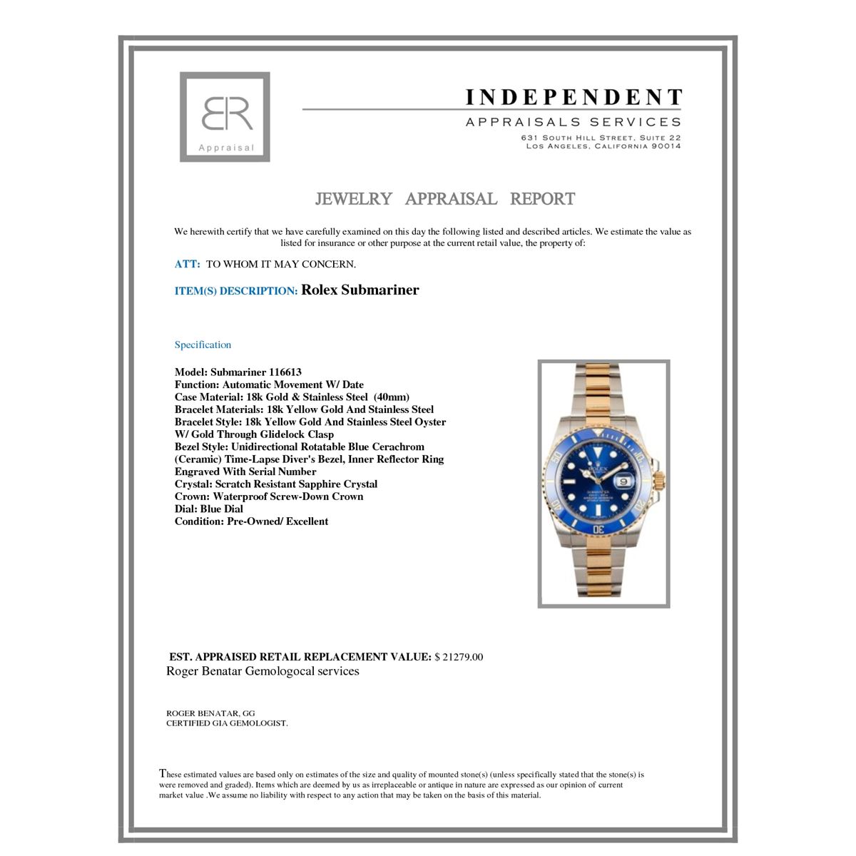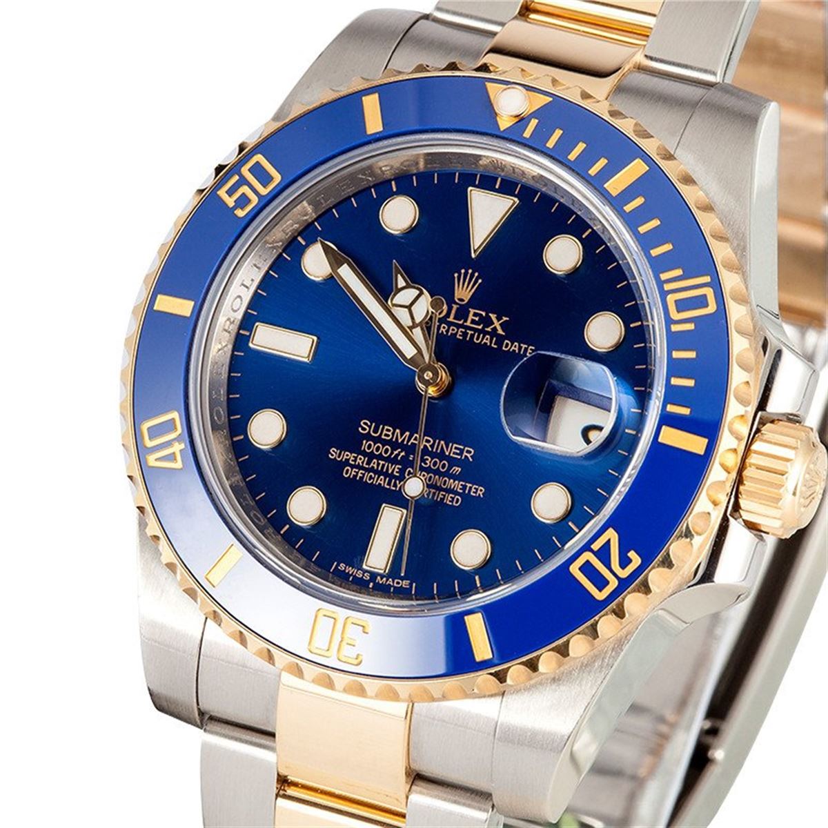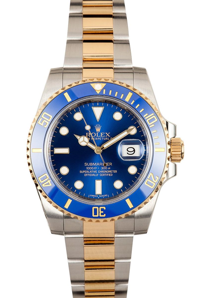 Model/Style-Submariner 116613 Serial/Year-Random Features-Automatic movement w/ date, waterproof screw-down crown, unidirectional rotatable blue Cerachrom (ceramic) time-lapse diver's bezel, scratch-resistant sapphire crystal Case-18k yellow gold & stainless steel (40mm), inner reflector ring engraved w/ serial number Bracelet-18k yellow gold and stainless steel Oyster w/ gold thru Glidelock clasp #9211