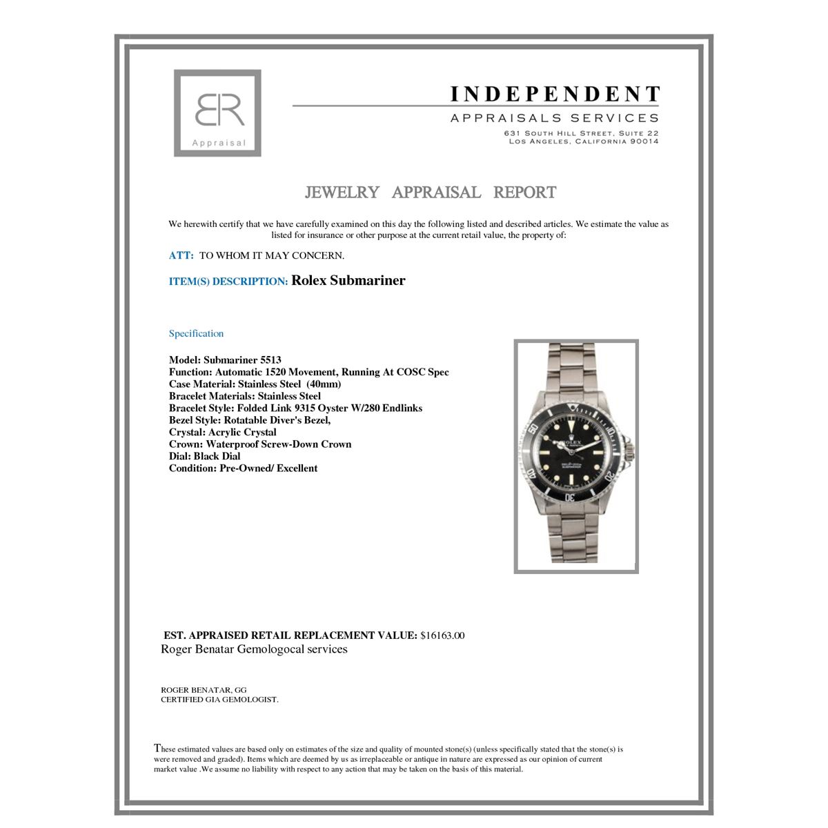 Model/Style-Submariner 5513 Serial/Year-Random Features-Automatic 1520 movement, running at COSC spec, has rotating diver's bezel, acrylic crystal, and water resistant screw-down crown. Case-Stainless steel case (40mm). Case is in mint condition with sharp beveled edges and original fat font insert. Bracelet-Folded link 9315 oyster w/280 endlinks. Bracelet is in excellent condition with minimal stretch. #9279