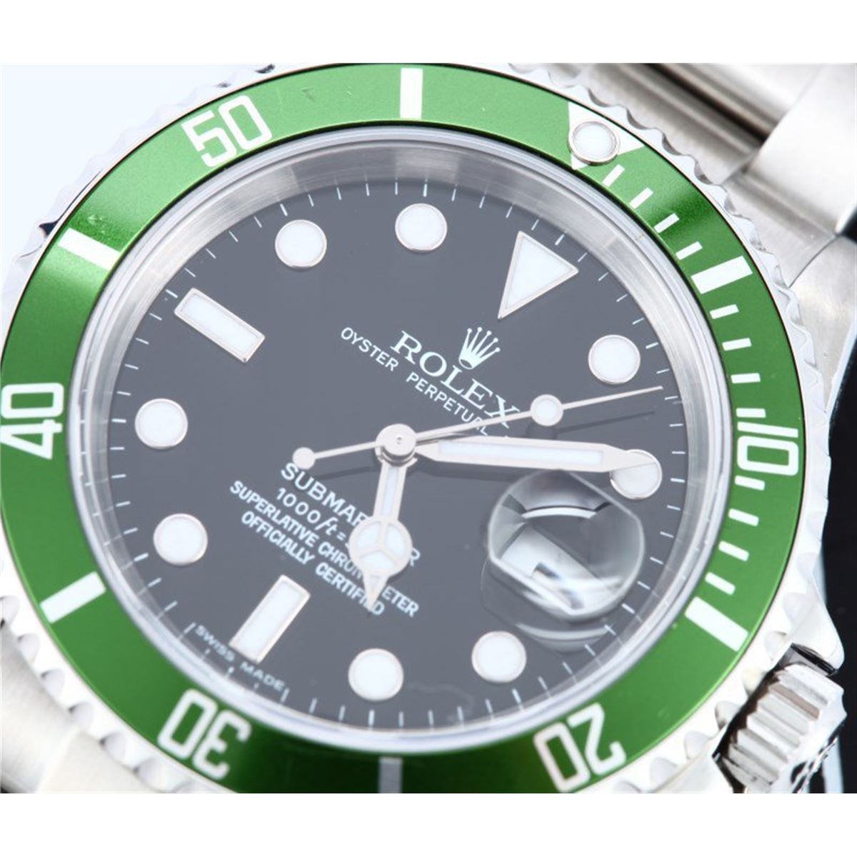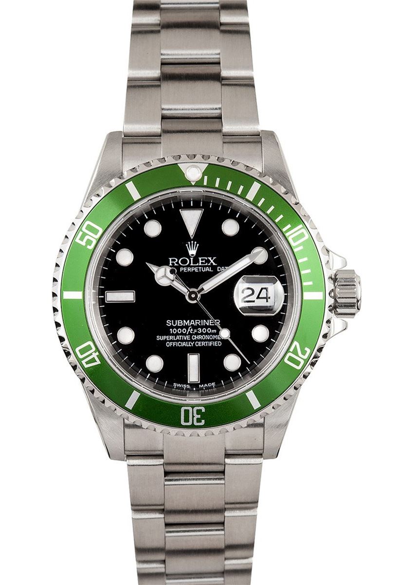 Model/Style-Submariner 16610V Serial/Year-Random Features-Automatic movement w/ date, waterproof screw-down crown, unidirectional rotatable diver's bezel, scratch-resistant sapphire crystal Case-Stainless steel w/ green bezel (40mm) Anniversary Edition (price adjustment for slight bezel scratch), no holes Bracelet-Stainless Steel Oyster #9216