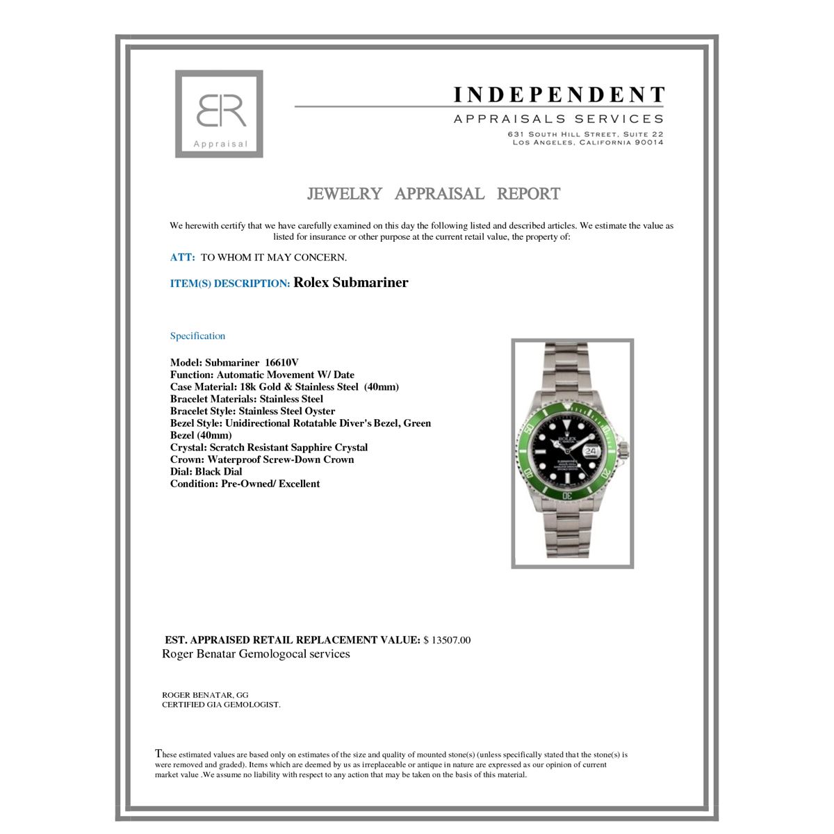 Not all jewelry, watches or loose stones are appraised and the appraisals are provided for bidders only in certain instances at the discretion of the Company. Appraisals, if any should be use to verify gemstone and or metal weights. The appraisals should not be used for valuation of any item. No guarantee, warranty or representation is intended by the Company in any appraisal. All dimensions and weights of such lots are approximate and are consistent with standards and practices in the industry. Condition reports are provided as a service to the prospective buyer. Bidders should take note that such descriptions are not warranties and that watches may need general service, change of battery or further repairs for which the buyer is solely responsible