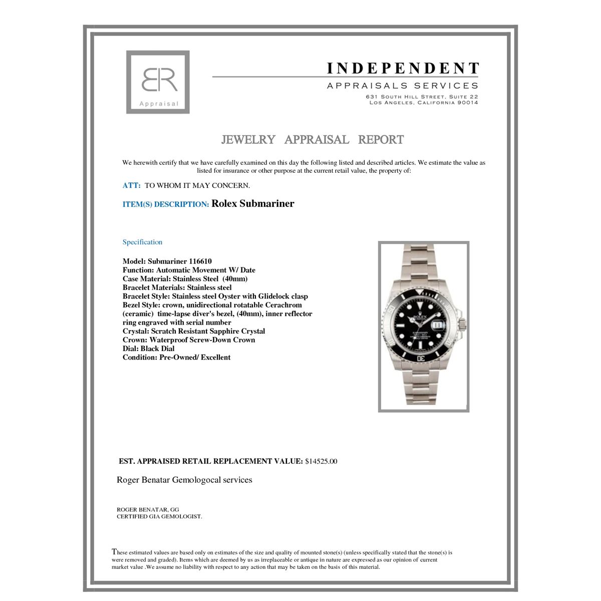 Model/Style-Submariner 116610 Serial/Year-Random Features-Automatic movement w/ date, waterproof screw-down crown, unidirectional rotatable Cerachrom (ceramic) time-lapse diver's bezel, scratch-resistant sapphire crystal Case-Stainless steel (40mm), inner reflector ring engraved with serial number, no holes case Bracelet-Stainless steel Oyster with Glidelock clasp #9261