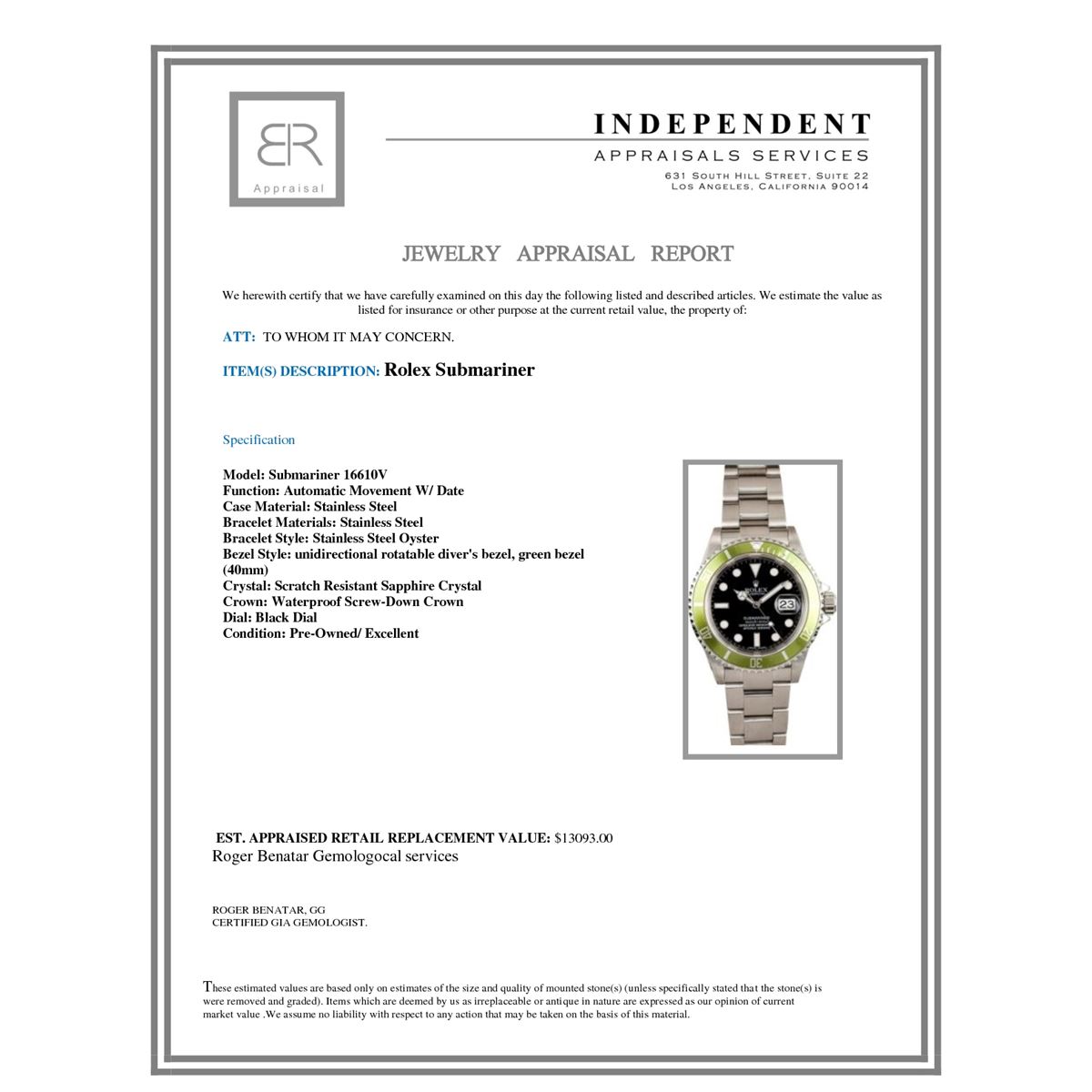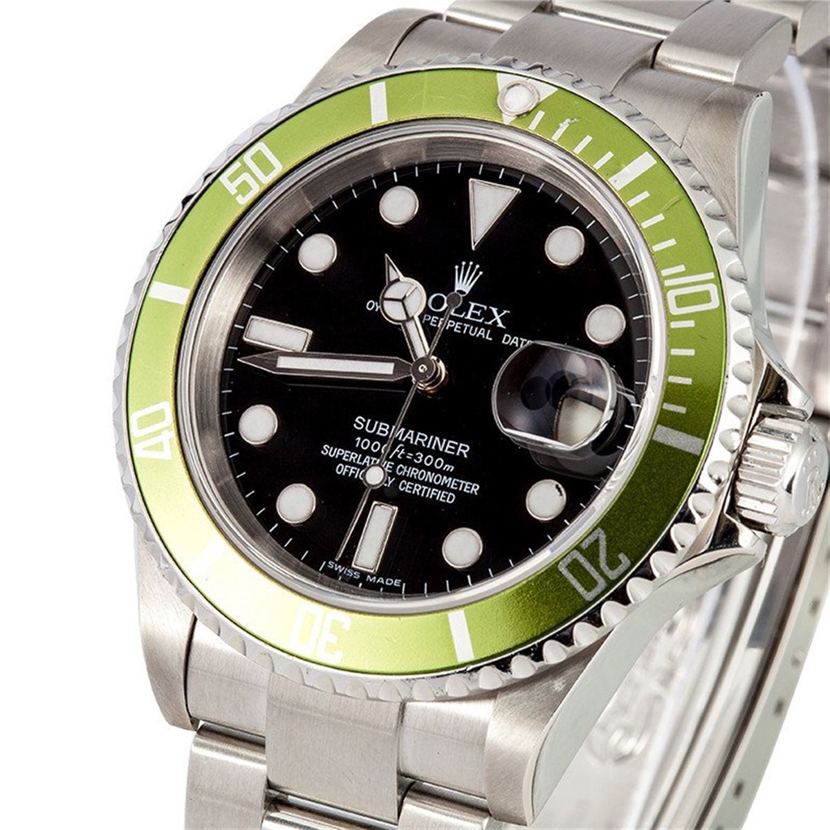 Model/Style-Submariner 16610V Serial/Year-Random Features-Automatic movement w/ date, waterproof screw-down crown, unidirectional rotatable diver's bezel, scratch-resistant sapphire crystal Case-Stainless steel w/ original naturally faded green bezel (40mm) Anniversary Edition, no holes Bracelet-Stainless Steel Oyster #9213