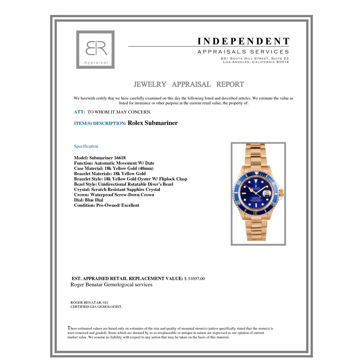 Not all jewelry, watches or loose stones are appraised and the appraisals are provided for bidders only in certain instances at the discretion of the Company. Appraisals, if any should be use to verify gemstone and or metal weights. The appraisals should not be used for valuation of any item. No guarantee, warranty or representation is intended by the Company in any appraisal. All dimensions and weights of such lots are approximate and are consistent with standards and practices in the industry. Condition reports are provided as a service to the prospective buyer. Bidders should take note that such descriptions are not warranties and that watches may need general service, change of battery or further repairs for which the buyer is solely responsible