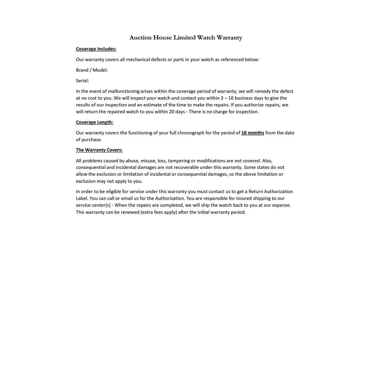 2 All items are sold AS IS, WHERE IS, WITH ALL FAULTS, ALL SALES ARE FINAL. NO REFUNDS AND NO EXCHANGES ARE ACCEPTED. THE COMPANY, AND ANY CONSIGNOR AS APPLICABLE, DISCLAIM ANY AND ALL WARRANTIES, EXPRESSED OR IMPLIED, INCLUDING BUT NOT LIMITED TO THE IMPLIED WARRANTY OF MERCHANTABILITY OR FITNESS FOR ANY PARTICULAR PURPOSE. NO WARRANTIES ARE MADE THAT ANY OF THE MERCHANDISE COMPLIES WITH ANY APPLICABLE GOVERNMENTAL RULES, REGULATIONS OR ORDINANCES OF ANY KIND OR NATURE WHATSOEVER. All items are available for inquiries prior to bidding. Written and oral descriptions are the opinions of this Company and should in no way be construed as a guarantee of any kind as to authenticity, age, condition, material or any other feature of items being sold. The Company believes that to the best of its knowledge information presented in any auction has come from reliable sources. However, such information is presented solely for the convenience of the prospective purchasers. The Company attempts to catalog every lot correctly and will attempt to point out any defects but will not be responsible or liable for the correctness of the catalog or other descriptions of the lot. It is the responsibility of the prospective bidders to examine all items in which they have an interest. By placing a bid, in any capacity, the bidder signifies that he/she has examined the items as fully as can be done to his/her satisfaction and have asked questions and received answers from the Company that are deemed adequate. If the bidder requires absolute certainty in all areas of authenticity, and the results of the evaluation leave uncertainly in the bidder’s mind, do not bid on the lot in question. The Company is not affiliated with any government entity and not all of the items sold were seized. Items sold by us are sourced from multiple channels and sources and there are no assurances that any of the items being sold have been seized. The Company is not authorized dealers of Rolex, Cartier or other watch brands that are sold at auction. We carry mostly pre-owned watches from secondary markets in exceptionally excellent condition. We guarantee you that the timepieces we sell are all authentic, unless otherwise stated where there are custom diamond parts including diamond bezels, diamond dials and/or diamond bands. We do not sell replicas of any kind. Diamonds used in the custom parts of watches are of top quality. An appraisal certificate is provided for every fine timepiece or jewelry purchased. Valuation may be based between actual purchase amount and its retail list price. In some cases, the item purchased may include its Original Warranty Certificate in the case of watches and Original Laboratory Certificate in the case of diamonds. Diamond or other precious or semi -precious stone jewelry is generally appraised by independent third parties such as GIA International or other similar associations or organizations. The appraisals are not intended as any warranties or representations of fact by this Company.