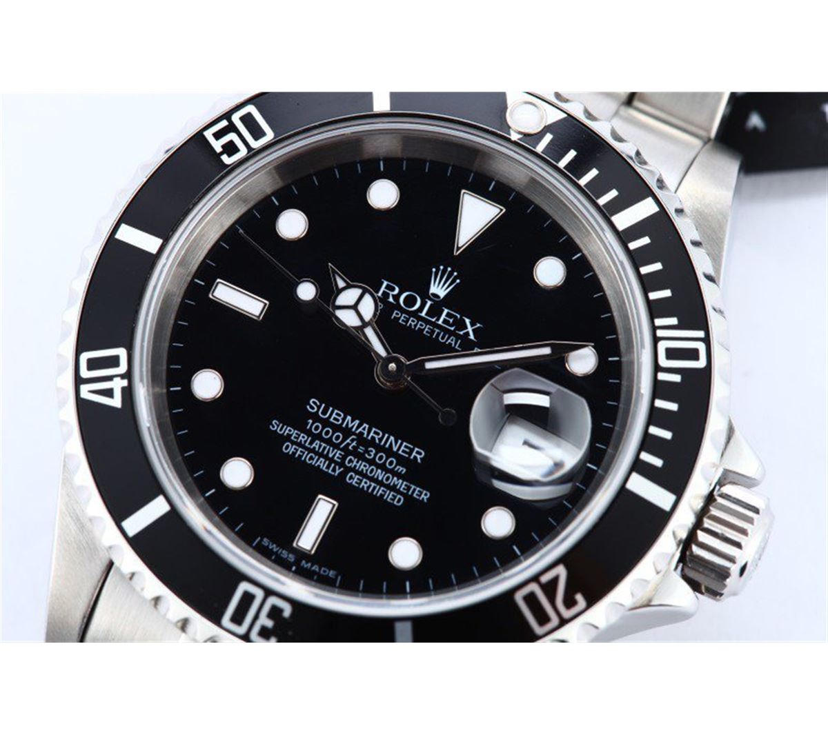 Model/Style-Submariner 16610 Serial/Year-Random Features-Automatic movement w/date, waterproof screw-down crown, unidirectional rotatable time-lapse diver's bezel, scratch-resistant sapphire crystal Case-Stainless steel (40mm), no holes Bracelet-Stainless steel Oyster #9265