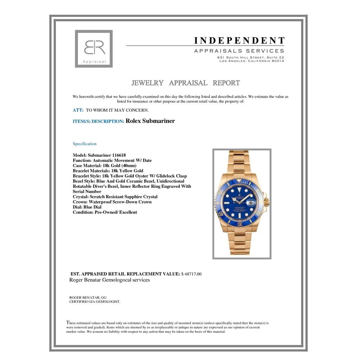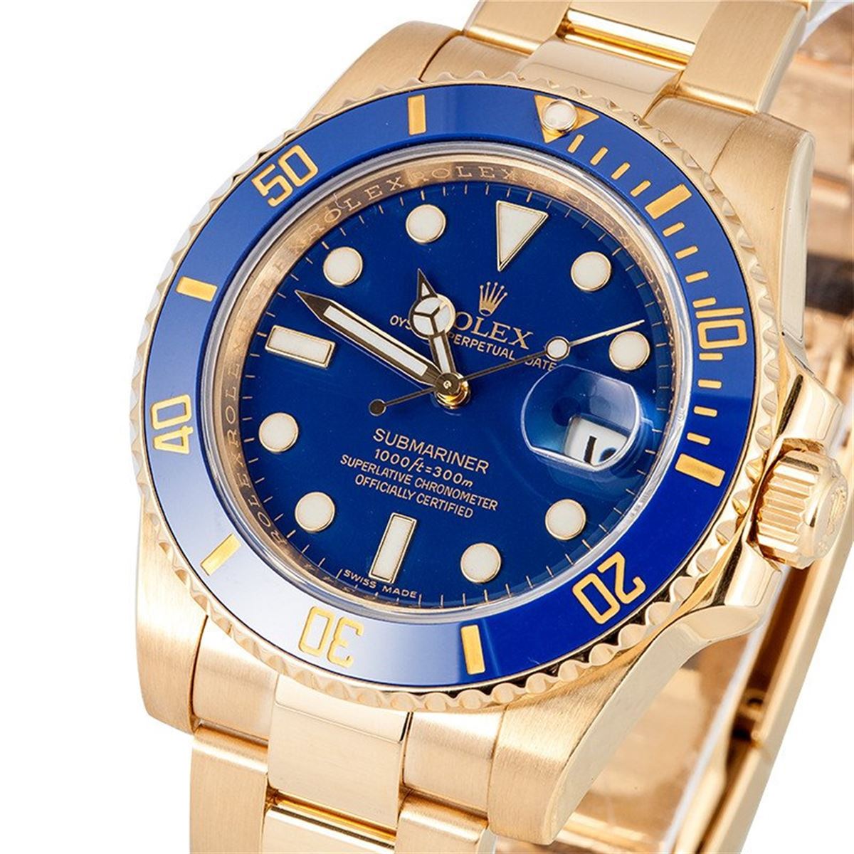 Model/Style-Submariner 116618 Serial/Year-Random Features-Automatic movement w/ date, waterproof screw-down crown, unidirectional rotatable diver's bezel, scratch-resistant sapphire crystal Case-18k yellow gold (40mm) w/ blue and gold ceramic bezel, inner reflector ring engraved w/ serial number Bracelet-18k yellow gold Oyster w/ Glidelock clasp #9207